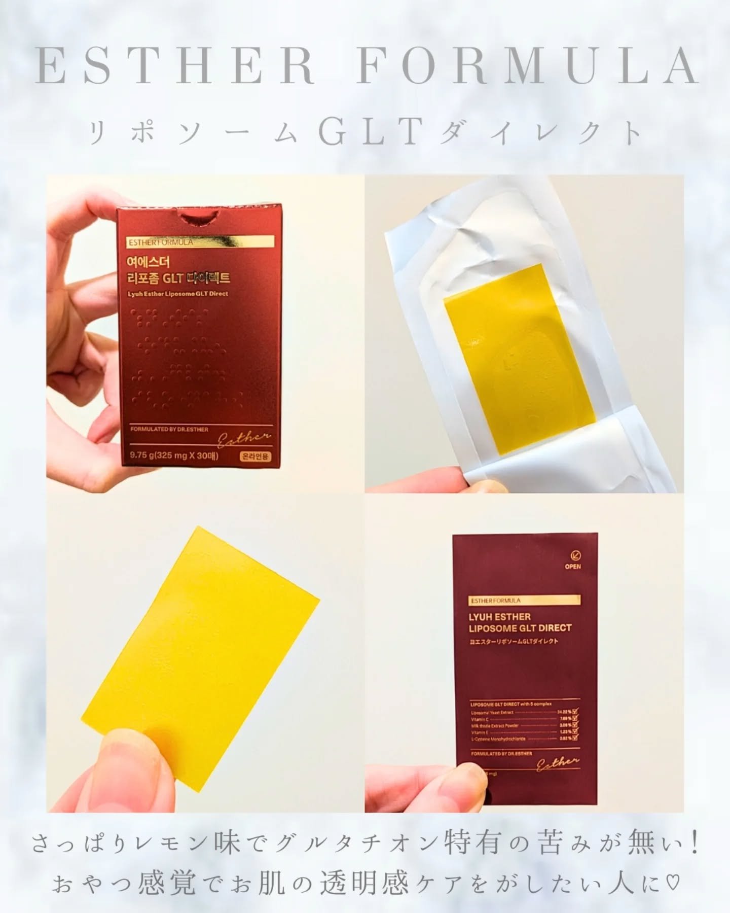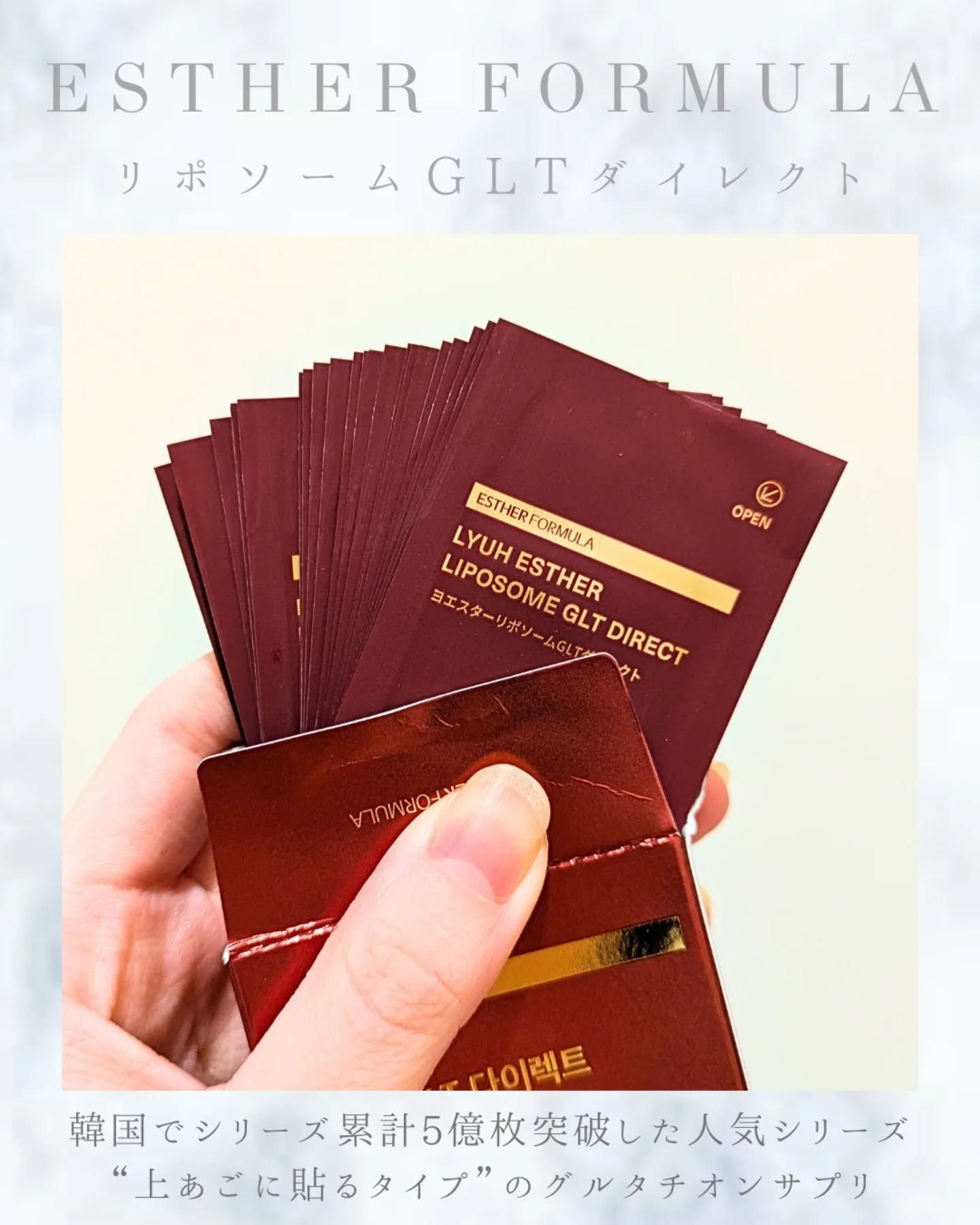 \\ESTHERFORMULA//ヨエスターリポソームGLTダイレクト貼るグルタチオンで有名なエスターフォーミュラのグルタチオンフィルムで手軽にインナーケア✨リポソーム形状の技術を適用した酵母エキス(L-美容成分90%以上)を1枚にたっぷり‼...