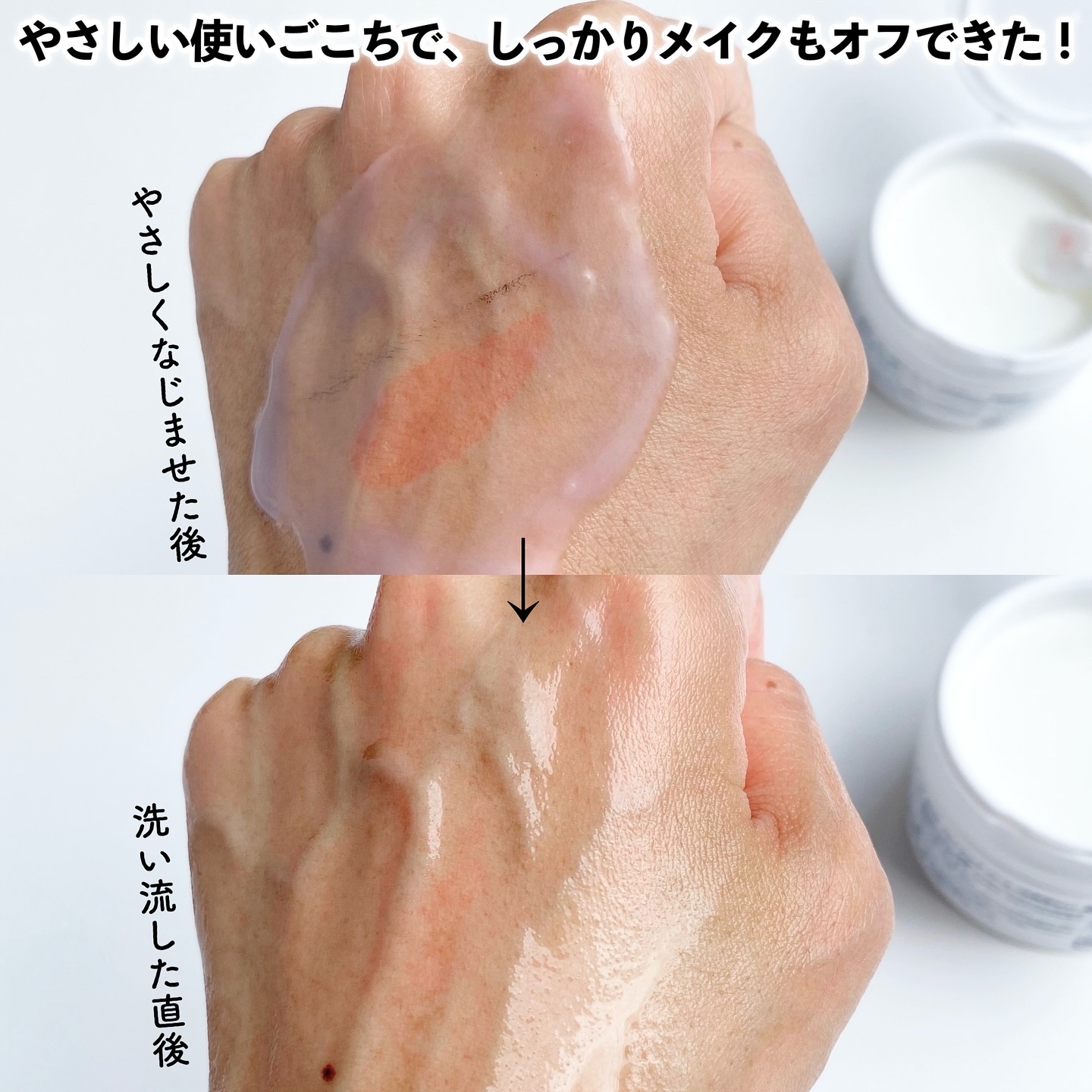 メイクを落とすだけじゃない! 厳選された8種類の天然植物オイル配合で 贅沢に肌を包み込み、 気になる大人のくすみ*肌にアプローチ🙌 濡れた手で使えるしマツエクOK、 ダブル洗顔不要で ウォータープルーフメイクもオフ👏 良いことづくし! ポンプから出した時はサラッとして見えるけど 指でなじませると濃厚なとろみを感じます。 この弾力オイルのおかげで 肌への負担を抑えながら メイクを浮かすことが出来ます。