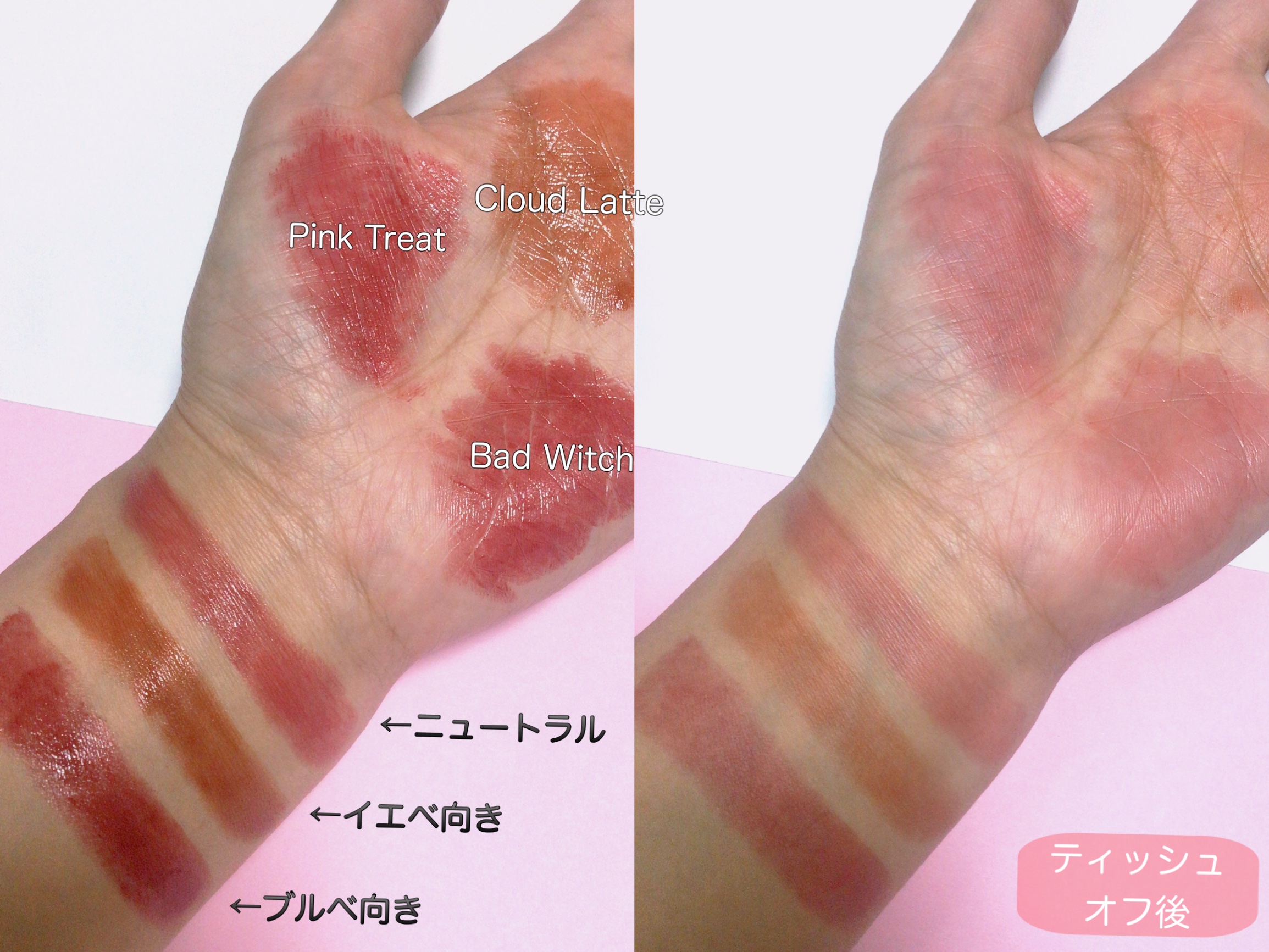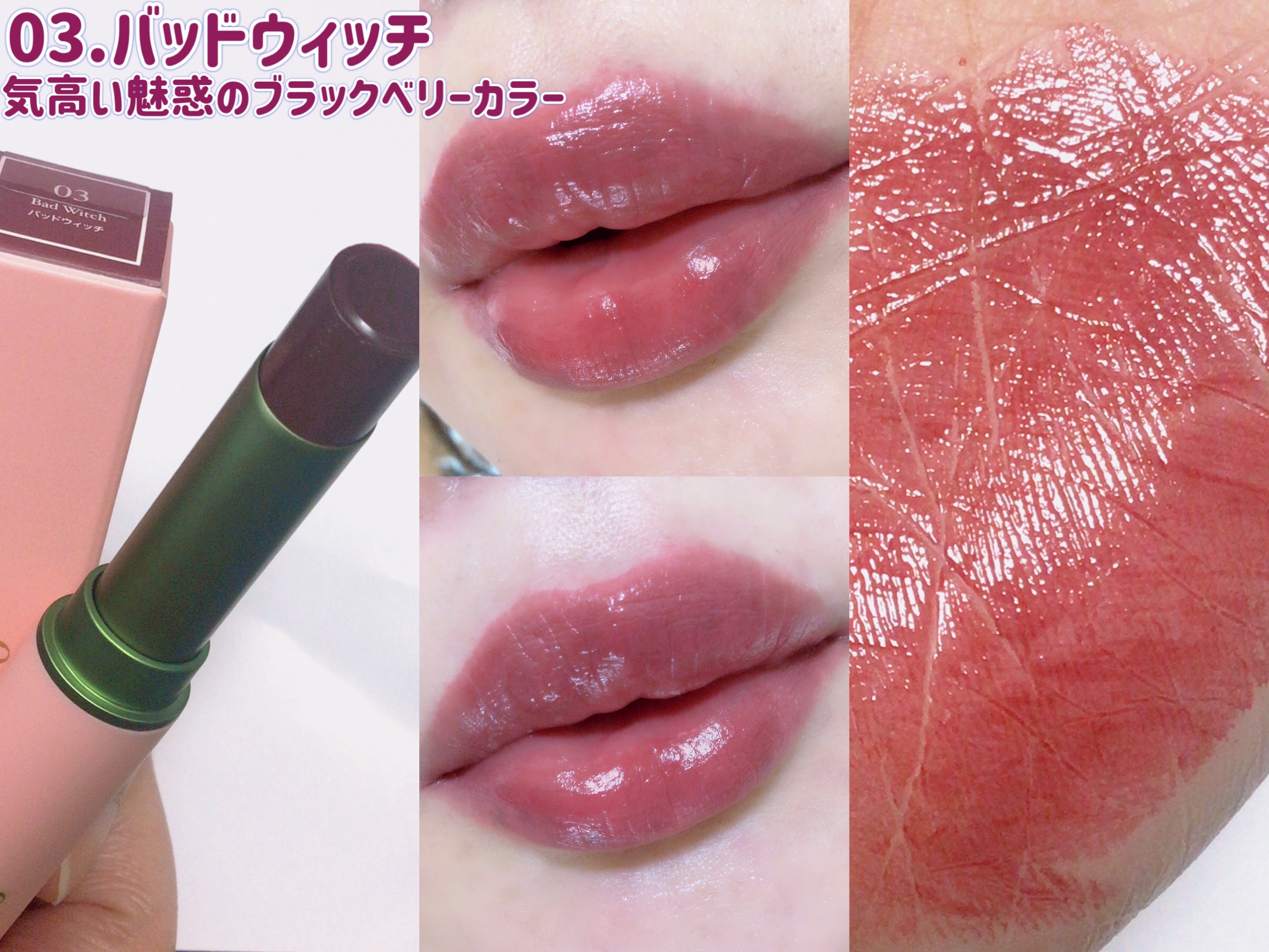 - <01 ピンクトリート> 水添ポリイソブテン、オクチルドデカノール、ダイマージリノール酸ダイマージリノレイルビス(ベヘニル/イソステアリル/フィトステリル)、ダイマージリノール酸水添ヒマシ油、テトラエチルヘキサン酸ペンタエリスリチル、合成ワックス、トリ(カプリル酸/カプリン酸)グリセリル、スクワラン、マイクロクリスタリンワックス、ダイマージリノール酸ダイマージリノレイル、カプリル酸プロピルヘプチル、テトライソステアリン酸ペンタエリスリチル、水添野菜油、ラウロイルグルタミン酸ジ(オクチルドデシル/フィトステリル/ベヘニル)、水添ポリデセン、リンゴ酸ジイソステアリル、ダイマージリノール酸ジオクチルドデシル、トリイソステアリン酸ポリグリセリル-2、トリ酢酸テトラステアリン酸スクロース、(セバシン酸/イソパルミチン酸)ジグリセリル、(エチレン/プロピレン)コポリマー、ジイソステアリン酸ポリグリセリル-2、プロパンジオール、トコフェロール、酸化鉄、酸化チタン、赤202、青1、赤223 <02 クラウドラテ> 水添ポリイソブテン、オクチルドデカノール、ダイマージリノール酸ダイマージリノレイルビス(ベヘニル/イソステアリル/フィトステリル)、ダイマージリノール酸水添ヒマシ油、テトラエチルヘキサン酸ペンタエリスリチル、合成ワックス、トリ(カプリル酸/カプリン酸)グリセリル、スクワラン、マイクロクリスタリンワックス、ダイマージリノール酸ダイマージリノレイル、カプリル酸プロピルヘプチル、テトライソステアリン酸ペンタエリスリチル、トリイソステアリン酸ポリグリセリル-2、水添野菜油、ラウロイルグルタミン酸ジ(オクチルドデシル/フィトステリル/ベヘニル)、水添ポリデセン、ダイマージリノール酸ジオクチルドデシル、トリ酢酸テトラステアリン酸スクロース、(セバシン酸/イソパルミチン酸)ジグリセリル、リンゴ酸ジイソステアリル、(エチレン/プロピレン)コポリマー、プロパンジオール、トリエトキシカプリリルシラン、トコフェロール、マイカ、酸化鉄、赤227、赤223 <03 バッドウィッチ> 水添ポリイソブテン、オクチルドデカノール、ダイマージリノール酸ダイマージリノレイルビス(ベヘニル/イソステアリル/フィトステリル)、ダイマージリノール酸水添ヒマシ油、テトラエチルヘキサン酸ペンタエリスリチル、合成ワックス、トリ(カプリル酸/カプリン酸)グリセリル、スクワラン、マイクロクリスタリンワックス、ダイマージリノール酸ダイマージリノレイル、カプリル酸プロピルヘプチル、テトライソステアリン酸ペンタエリスリチル、水添野菜油、ラウロイルグルタミン酸ジ(オクチルドデシル/フィトステリル/ベヘニル)、水添ポリデセン、リンゴ酸ジイソステアリル、ダイマージリノール酸ジオクチルドデシル、トリイソステアリン酸ポリグリセリル-2、トリ酢酸テトラステアリン酸スクロース、(セバシン酸/イソパルミチン酸)ジグリセリル、ジイソステアリン酸ポリグリセリル-2、(エチレン/プロピレン)コポリマー、プロパンジオール、トリエトキシカプリリルシラン、トコフェロール、マイカ、黄5、赤202、酸化鉄、黄4、青1、赤223