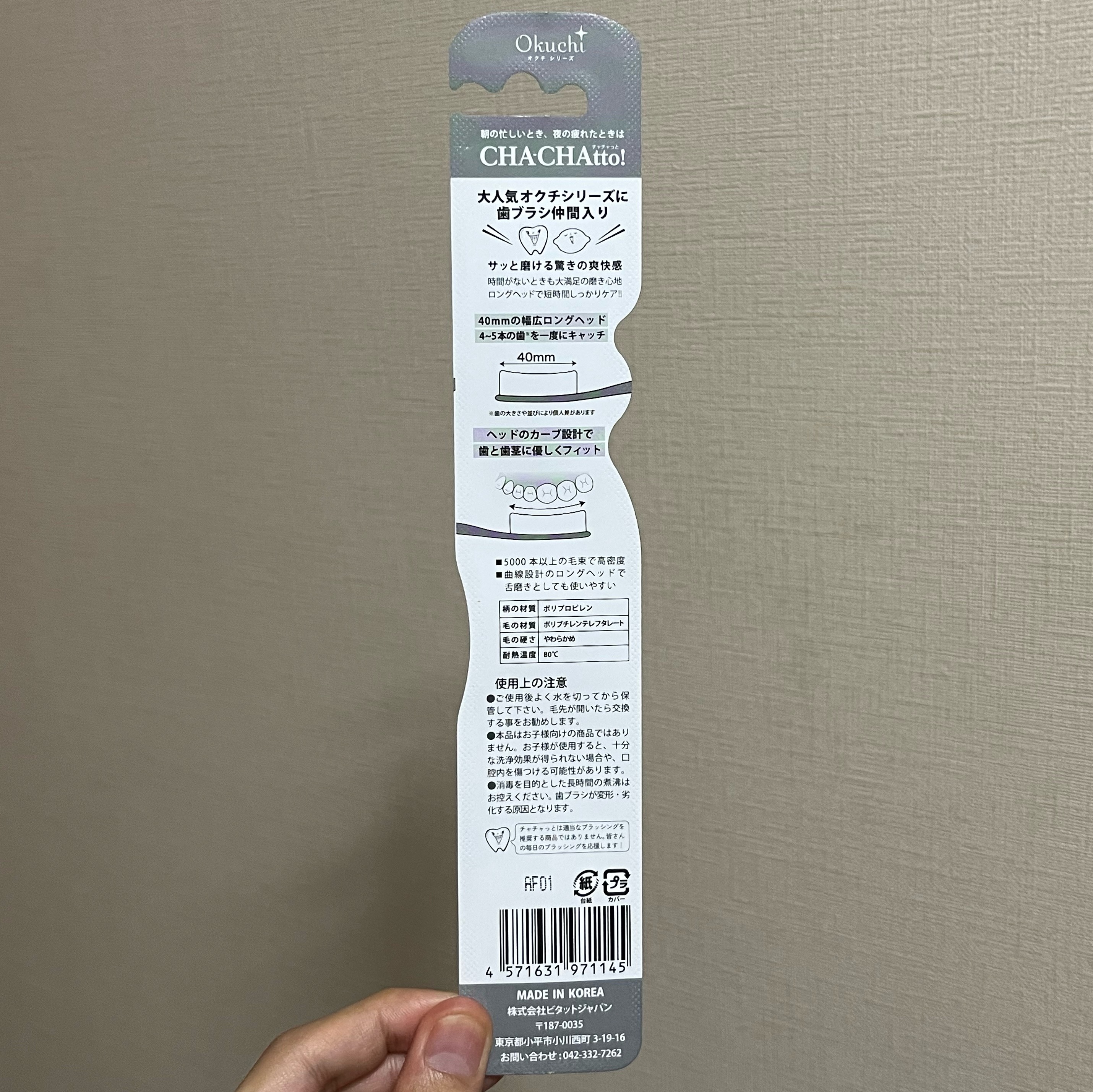 - (1) 一般的な歯ブラシの4倍以上!5,000本以上の超高密度ブラシ毛を採用 一般的な歯ブラシが約700~1,200本の毛束であるのに対し、『CHA-CHAtto』は5,000本以上の非常に密度が高いブラシ毛を使用しています。一度のブラッシングで広範囲に毛先が届き、歯の表面の汚れを素早く、確実に取り除きます。また舌のケアにも役立つ万能な設計です。 (2) 独自のカーブ設計と安全なヘッド形状 ヘッド部分は適度にカーブさせた設計を採用。強すぎるカーブを避けることで、奥歯や裏側など磨きにくかった場所にも自然にフィットします。また、ヘッド先端は丸く幅広な安全設計で、急いで磨く場面でも口の中を傷つけるリスクを軽減しています。 (3) 手に馴染む快適なグリップ設計 グリップ部分はフラットで厚みがあり、手に自然に馴染むよう設計されています。手首や指に負担をかけず、細かな動きも自由自在にコントロール可能。忙しい朝でもストレスなく快適に使えます。 (4) 衛生的なブラシ毛素材(PBT)を採用 ブラシ毛には吸水率の非常に低いPBT素材を採用しました。この素材は水分をほとんど吸収しないため水切れが良く、湿気が溜まりにくいためカビや雑菌の繁殖を抑え、常に衛生的に保つことができます。