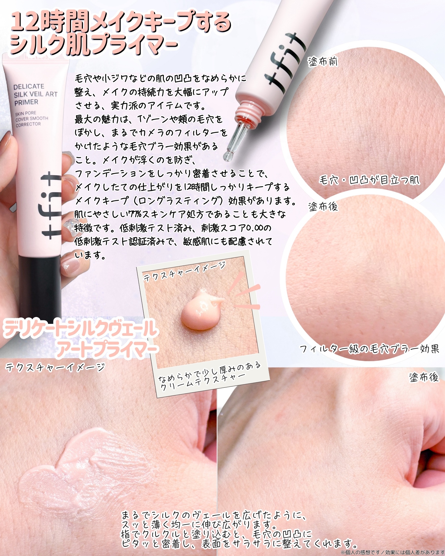 TFIT@TFIT_JP様から頂きました🎁 🤍デリケートシルクヴェールアートプライマー凸凹のある毛穴や肌のキメをなめらかにカバーしてくれるプライマー✨️スキンケア成分77%配合なのも嬉しいポイント🩷低刺激テスト済みで、敏感肌にも使いやすい🫶🏻...