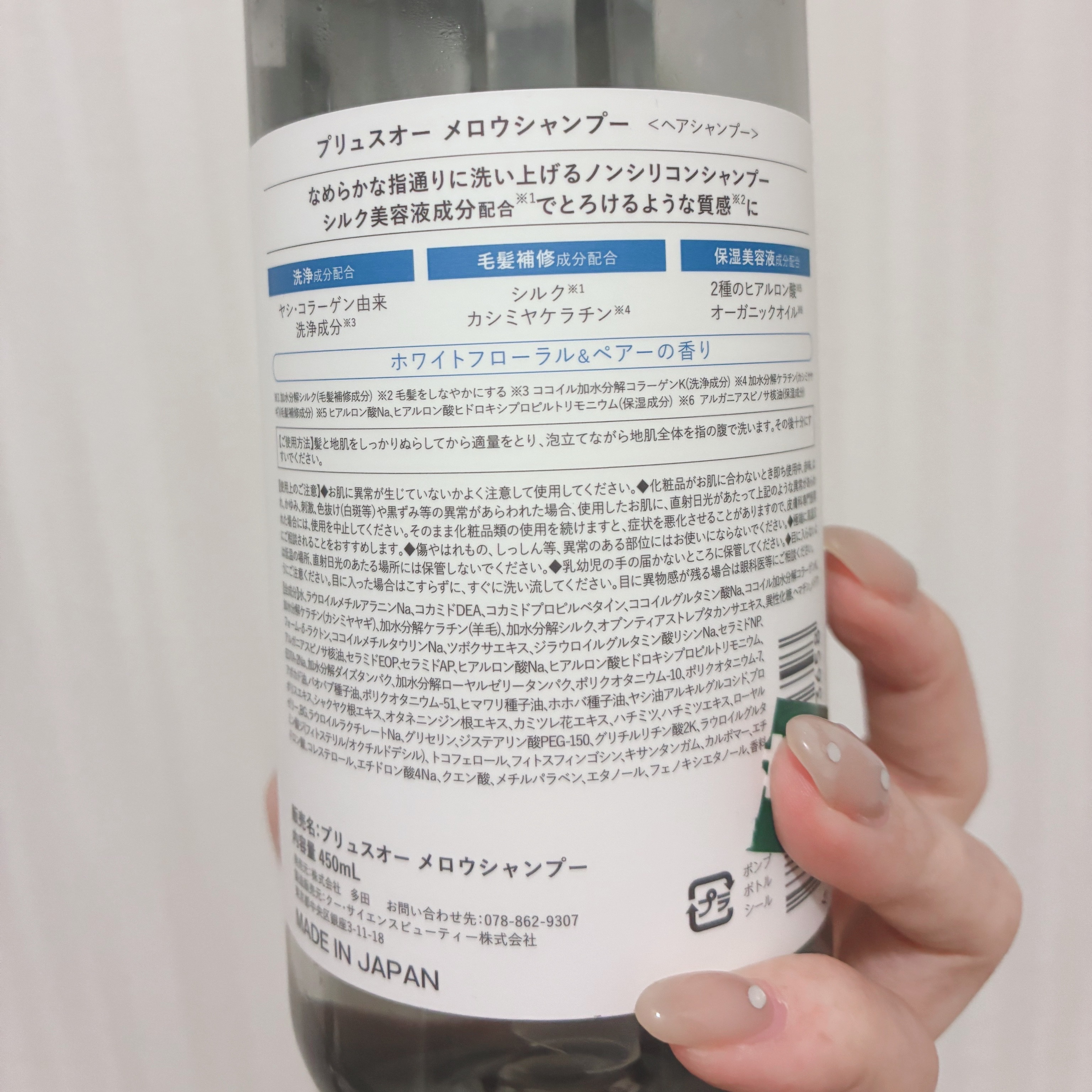 - <シャンプー 450ml> 水、ラウロイルメチルアラニンNa、コカミドDEA、コカミドプロピルベタイン、ココイルグルタミン酸Na、ココイル加水分解コラーゲンK、加水分解ケラチン(カシミヤヤギ)、加水分解ケラチン(羊毛)、加水分解シルク、オプンティアストレプタカンサエキス、異性化糖、ヘマチン、メドウフォーム-δ-ラクトン、ココイルメチルタウリンNa、ツボクサエキス、ジラウロイルグルタミン酸リシンNa、セラミドNP、アルガニアスピノサ核油、セラミドEOP、セラミドAP、ヒアルロン酸Na、ヒアルロン酸ヒドロキシプロピルトリモニウム、EDTA-2Na、加水分解ダイズタンパク、加水分解ローヤルゼリータンパク、ポリクオタニウム-10、ポリクオタニウム-7、アボカド油、バオバブ種子油、ポリクオタニウム-51、ヒマワリ種子油、ホホバ種子油、ヤシ油アルキルグルコシド、プロポリスエキス、シャクヤク根エキス、オタネニンジン根エキス、カミツレ花エキス、ハチミツ、ハチミツエキス、ローヤルゼリー、BG、ラウロイルラクチレートNa、グリセリン、ジステアリン酸PEG-150、グリチルリチン酸2K、ラウロイルグルタミン酸ジ(フィトステリル/オクチルドデシル)、トコフェロール、フィトスフィンゴシン、キサンタンガム、カルボマー、エチドロン酸、コレステロール、エチドロン酸4Na、クエン酸、メチルパラベン、エタノール、フェノキシエタノール、香料 <トリートメント 450ml> 水、ステアリルアルコール、グリセリン、ハチミツ、ベヘントリモニウムクロリド、ジメチコン、加水分解ケラチン(カシミヤヤギ)、加水分解シルク、加水分解コラーゲン、水溶性コラーゲン、サクシノイルアテロコラーゲン、加水分解ケラチン(羊毛)、加水分解ケラチン、アルガニアスピノサ核油、ツバキ種子油、ホホバ種子油、セラミドNP、アボカド油、バオバブ種子油、ヒマワリ種子油、メドウフォーム-δ-ラクトン、プルケネチアボルビリス種子油、ポリクオタニウム-51、ポリクオタニウム-64、加水分解ローヤルゼリータンパク、ヒアルロン酸Na、ヒアルロン酸ヒドロキシプロピルトリモニウム、ジラウロイルグルタミン酸リシンNa、メドウフォーム油、セラミドAP、セラミドEOP、ポリクオタニウム-10、ヨモギ葉エキス、モモ葉エキス、アマモエキス、レモン果実エキス、グレープフルーツ果実エキス、ミツイシコンプエキス、ゴボウ根エキス、コーヒー種子エキス、アプンティアストレプタカンサエキス、豆乳発酵液、グレープフルーツ果皮油、ゴマ油、シア脂、加水分解ダイズタンパク、BG、黒砂糖、ステアリン酸PEG-55、シクロベンタシロキサン、アルギニン、グルタミン酸、ステアルトリモニウムクロリド、グリチルリチン酸2K、グルコシルルチン、ラウロイウグルタミン酸ジ(フィトステリル/オクチルドデシル)、ラウロイルラクチレートNa、ベンチレングリコール、ヘマチン、ユビキノン、水添レシチン、トコフェロール、フィトスフィンゴシン、コレステロール、キサンタンガム、カルポマー、腐植土抽出物、イソプロパノール、ヒドロキシエチルセルロース、ジココジモニウムクロリド、フェノキシエタノール、アモジメチコン、アミノプロピルジメチコン、エタノール、香料 <シャンプー詰替用 350ml> 水、ラウロイルメチルアラニンNa、コカミドDEA、コカミドプロピルベタイン、ココイルグルタミン酸Na、加水分解ケラチン(カシミヤヤギ)、加水分解ケラチン(羊毛)、加水分解シルク、ココイル加水分解コラーゲンK、オプンティアストレプタカンサエキス、異性化糖、ヘマチン、メドウフォーム-δ-ラクトン、ココイルメチルタウリンNa、ツボクサエキス、ジラウロイルグルタミン酸リシンNa、セラミドNP、アルガニアスピノサ核油、セラミドEOP、セラミドAP、ヒアルロン酸Na、ヒアルロン酸ヒドロキシプロピルトリモニウム、EDTA-2Na、加水分解ダイズタンパク、加水分解ローヤルゼリータンパク、ポリクオタニウム-10、ポリクオタニウム-7、アボカド油、バオバブ種子油、ポリクオタニウム-51、ヒマワリ種子油、ホホバ種子油、ヤシ油アルキルグルコシド、プロポリスエキス、シャクヤク根エキス、オタネニンジン根エキス、カミツレ花エキス、ハチミツ、ハチミツエキス、ローヤルゼリー、BG、ラウロイウラクチレートNa、グリセリン、ジステアリン酸PEG-150、グリチルリチン酸2K、ラウロイルグルタミン酸ジ(フィトステリル/オクチルドデシル)、トコフェロール、フィトスフィンゴシン、キサンタンガム、カルポマー、エチドロン酸、コレステロール、エチドロン酸4Na、クエン酸、メチルパラベン、エタノール、フェノキシエタノール、香料 <トリートメント詰替用 350ml> 水、ステアリルアルコール、グリセリン、ハチミツ、ベヘントリモニウムクロリド、ジメチコン、加水分解シルク、加水分解ケラチン(カシミヤヤギ)、加水分解ケラチン(羊毛)、加水分解ケラチン、加水分解コラーゲン、水溶性コラーゲン、サクシノイルアテロコラーゲン、アルガニアスピノ