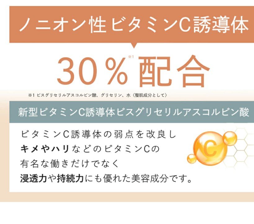 - 注目の美容成分【ノニオン性ビタミンC誘導体】を30%配合した集中ケア美容液。お肌を優しくサポート。敏感肌の方にもご利用頂ける優しい付け心地となっております。化粧水の後にご使用ください。