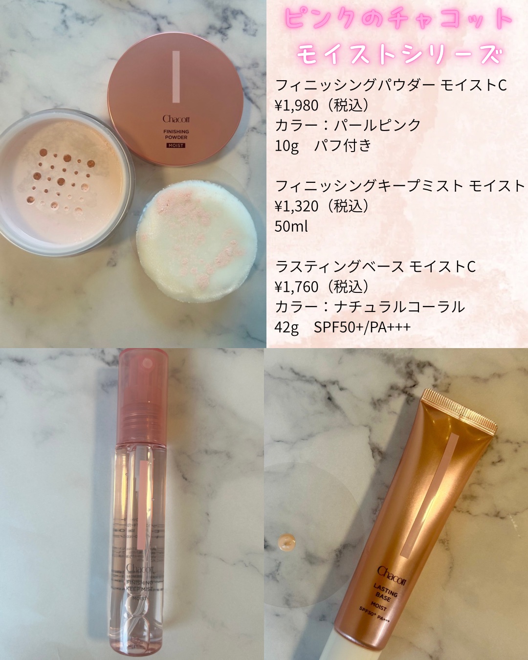 秋冬の気候にぴったりなモイストシリーズも注目です。 通常のラスティングベースを持ってるんだけど、比較するとテクスチャーがみずみずしく、カバー力よりもカラー補正でくすみをカバー*してくれる感じ。 モイストタイプはこれからの季節にぴったりなしっとりとしたつけ心地!チャコットのミストが好きな人なら切り替えに◯