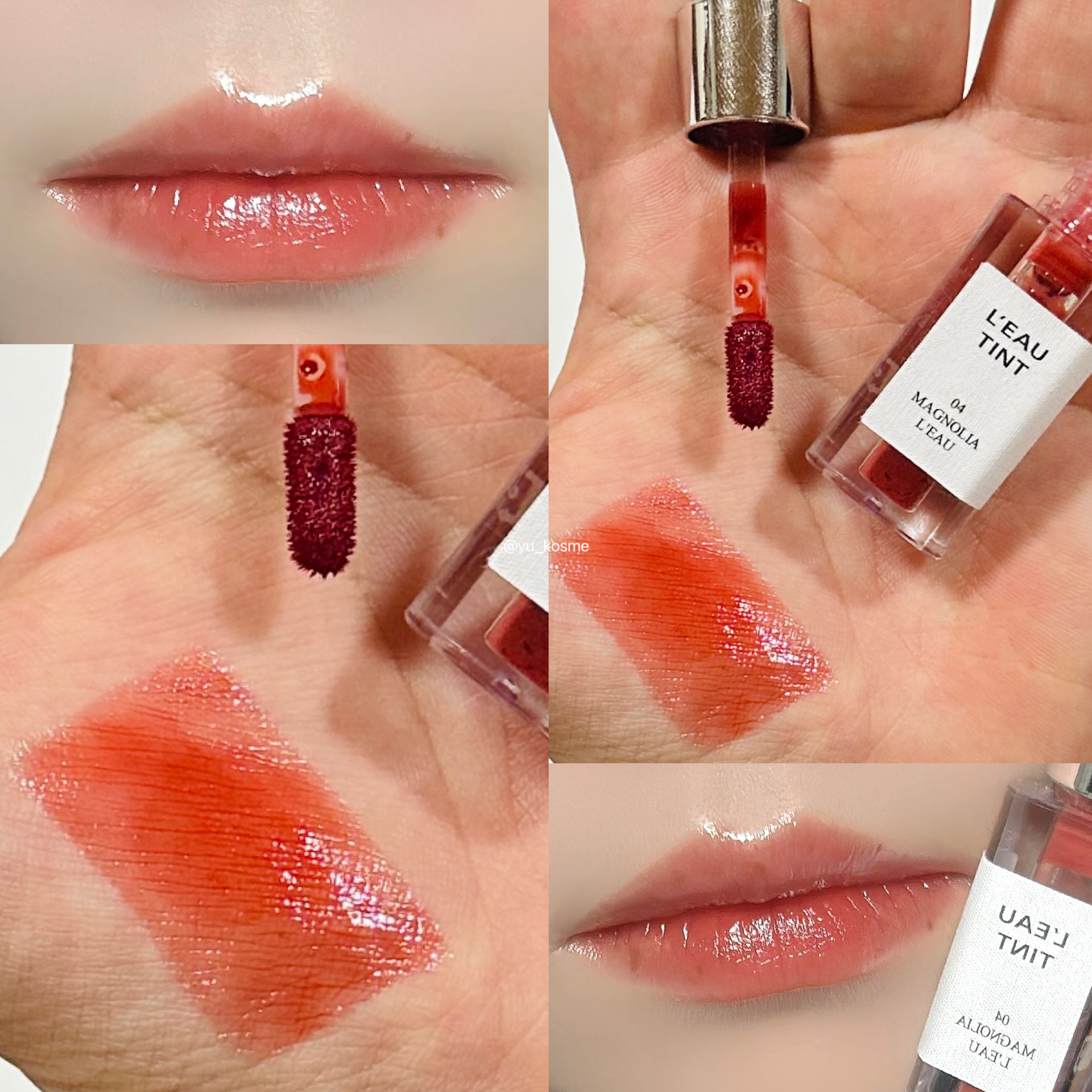 色持ち抜群ティント🩷 01&04はイエベさんにおすすめのカラー♡ 水のようなテクスチャーでスルスルのびる🫧 塗りたても少し時間をおけばベタつきにくいです! 色持ちは食事をしても元の唇の色まで戻ったことはほとんどありません! さすが飲み会リップ💄✨