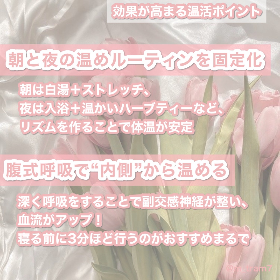 身体が冷えることによって血行が悪くなり、栄養が肌や髪に十分に届かなくなる。体温の低下は代謝を妨げ、老廃物の排出が滞りやすくなってしまう。 ぽかぽかカイロソックス ¥2,068(税込) 冬の足元の冷えや、冷え性にもおすすめ♡ 過去のぽかぽかカイロソックスよりも更に温かい🔥 温かい飲み物(生姜湯、ハーブティーなど)を取り入れ、体を内側から温める。鉄分やビタミンEを多く含む食品(ほうれん草、ナッツ類)を摂取し、血行を促進する。
