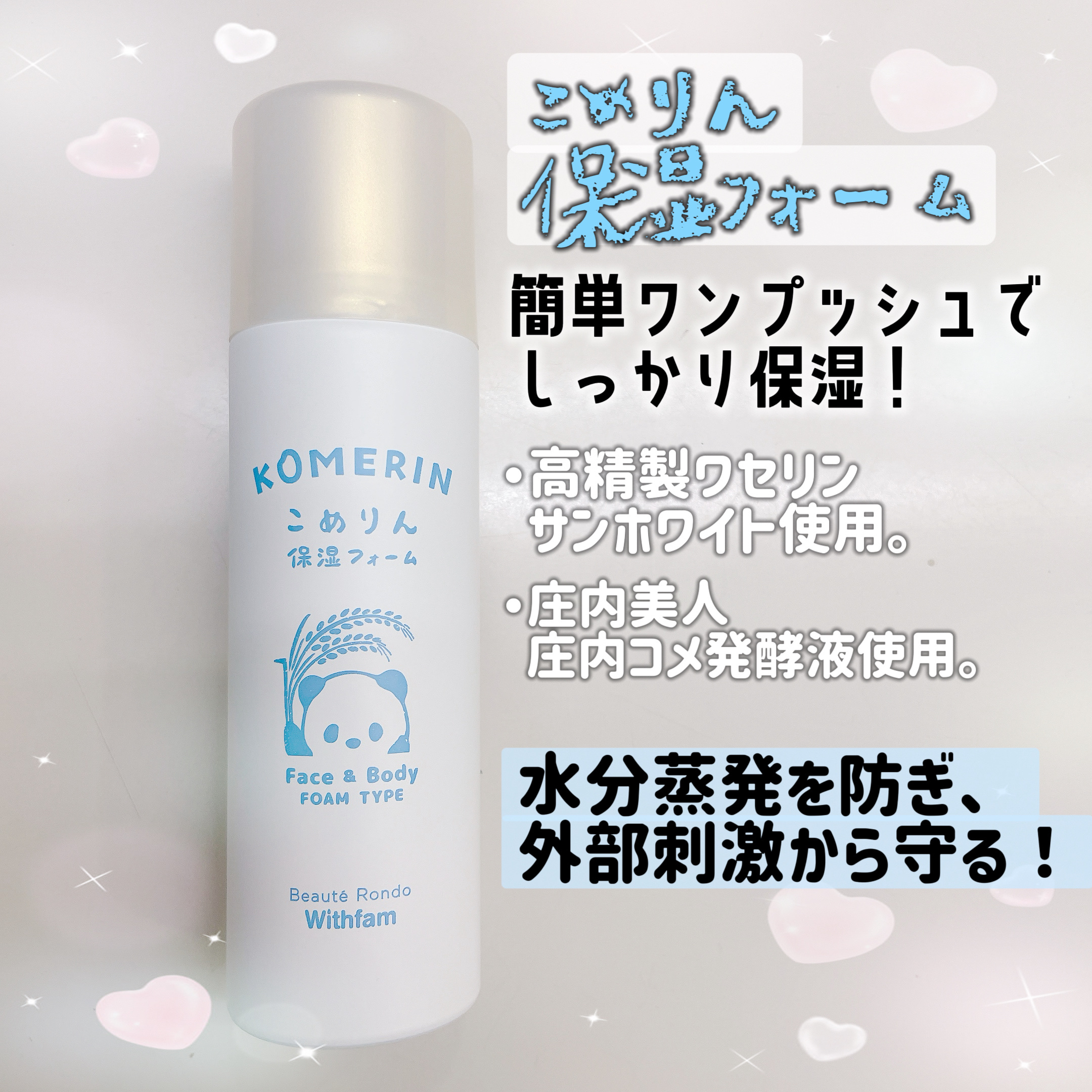 - 新感覚!ワセリンをフォーム状にすることでワセリン特有のべたつきを抑えることに成功しました。 国産にこだわった“コメ発酵液×高精製ワセリン”配合のうるおい密封泡で全身保湿! 肌荒れ・乾燥トラブルに! 肌を守る・整えるがワンプッシュで完結。 ①乾燥や肌荒れから守る ・庄内美人純生コメ発酵液*¹配合 ・高精製ワセリン*¹でうるおいを届ける ・グリチルリチン酸2K(整肌成分)配合 ・5種のセラミド*²配合 ②健やかな肌に育てる ・うるおいを抱え込むアミノ酸由来成分*³配合 ・豊富な和漢植物成分*⁴配合 〈4つの無添加処方〉 ●パラベンフリー●アルコールフリー●無着色 ●無香料 *¹保湿成分 *²セラミドEOP、セラミドNP、セラミドAP、セラミドNG、セラミドAG(保湿成分) *³グルタチオン、PCA-Na(保湿成分) *⁴ハトムギ種子エキス、ユキノシタエキス、シャクヤク根エキス、トウキ根エキス、ドクダミエキス、クララ根エキス、マグワ根皮エキス、ノイバラ果実エキス、ボタンエキス、クズ根エキス、アロエベラ葉エキス