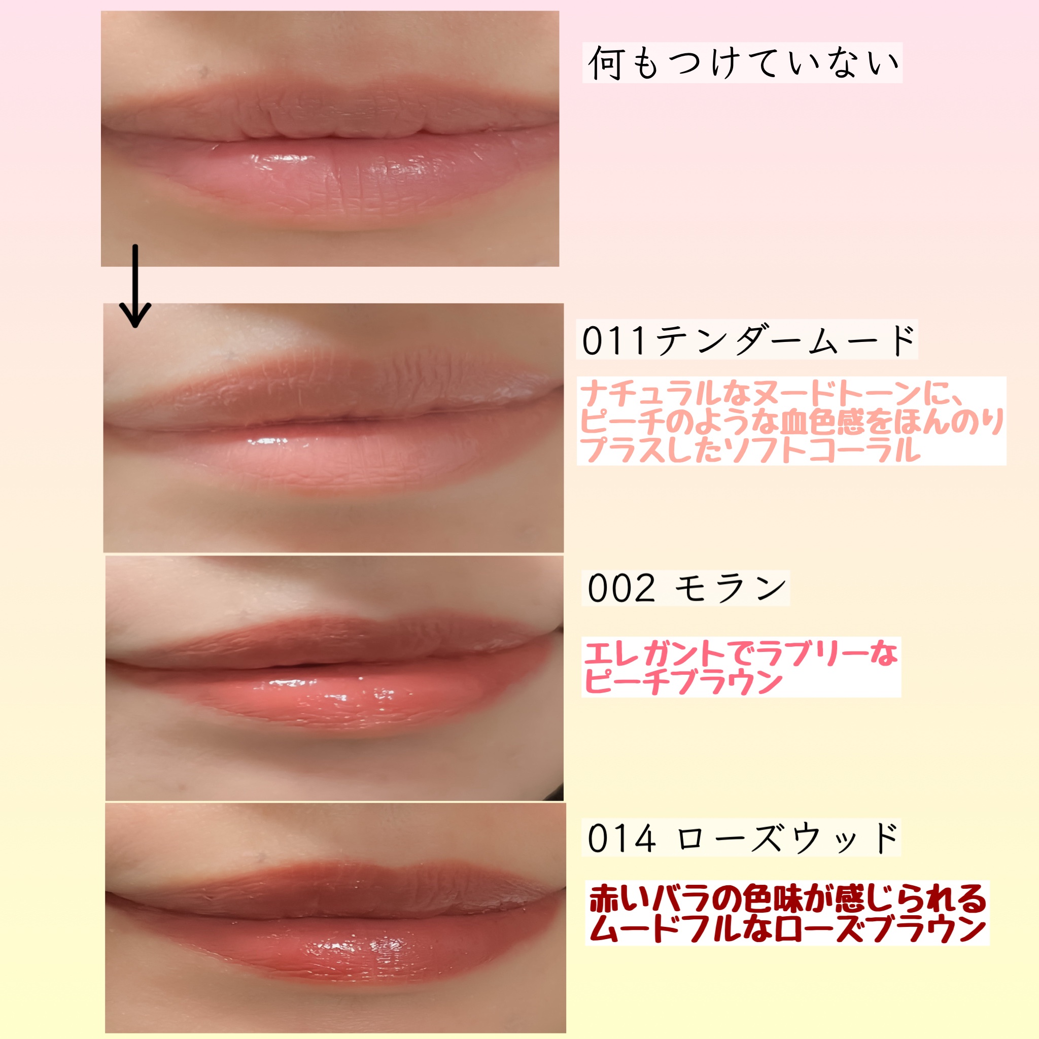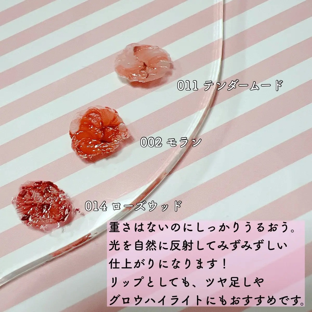- <001 トゥシューズ> ビス-ベヘニル/アイソステアリル/フィトステリルダイマーダイリノレイルダイマーダイリノレエイト、ポリアイソブテン、ダイアイソステアリルマレート、ホホバ種子油、合成ワックス、¥ダイフェニルジメチコン、ポリグリセリル-2トライアイソステアレート、トライデシルトライメリテート、ダイペンタエリスリチルヘキサヒドロキシステアレート/ヘクサステアレート/ヘクサロジネート、水添ポリアイソブテン、トコフェリルアセテート、二酸化チタン、カプリリック/カプリックトリグリセリド、カンデリラワックス、ソルビタンセスキオレイエート、ヒマワリ種子ワックス、地母根エキス、マイクロクリスタリンワックス、ステアラルコニウムヘクトライト、ポリヒドロキシステアリン酸、レシチン、アイソステアリン酸、アイソプロピルミリステート エチルヘキシルパルミテート、二酸化チタン/二酸化チタン、エチレン/プロピレンコポリマー プロピレンカーボネート、ポリグリセリル-3ポリリシノレエート、ダイメチコン、トコフェロール、精製水、ブチレングリコール、グリセリン、1,2-ヘキサンジオール、カプリリルグリコール ノナペプチド-1、アセチルヘキサペプチド-8、カッパトライペプチド-1、トライペプチド-1、パルミトイルテトラペプチド-7、パルミトイルトライペプチド-1、パルミトイルペンタペプチド-4、ヘクサペプチド-9、デヒドロ酢酸、黄色4号、赤色201号、赤色酸化鉄、赤色202号、赤色218号 <002 モラン(牡丹)> ビス-ベヘニル/アイソステアリル/フィトステリルダイマーダイリノレイルダイマーダイリノレエイト、ポリアイソブテン、ダイアイソステアリルマレート、ホホバ種子油、合成ワックス、ダイフェニルジメチコン、ポリグリセリル-2トライアイソステアレート、トライデシルトライメリテート、ダイペンタエリスリチルヘキサヒドロキシステアレート/ヘクサステアレート/ヘクサロジネート、水添ポリアイソブテン、トコフェリルアセテート、カプリリック/カプリックトリグリセリド、カンデリラワックス、二酸化チタン、ソルビタンセスキオレイエート、ヒマワリ種子ワックス、ウコン根エキス、地母根エキス、マイクロクリスタリンワックス、ステアラルコニウムヘクトライト、ポリヒドロキシステアリン酸、レシチン、アイソステアリン酸、アイソプロピルミリステート、エチルヘキシルパルミテート、エチレン/プロピレンコポリマー、プロピレンカーボネート、二酸化チタン/二酸化チタン、ポリグリセリル-3ポリリシノレエート、ダイメチコン、アラビアゴム、マルトデキストリン、トコフェロール、精製水、ブチレングリコール、グリセリン、1,2-ヘキサンジオール、カプリリルグリコール、ノナペプチド-1、アセチルヘキサペプチド-8、カッパトライペプチド-1、トライペプチド-1、パルミトイルテトラペプチド-7、パルミトイルトライペプチド-1、パルミトイルペンタペプチド-4、ヘクサペプチド-9、デヒドロ酢酸、赤色酸化鉄、黄色4号、赤色202号、等色201号 <003 ストロベリー> ビス-ベヘニル/アイソステアリル/フィトステリルダイマーダイリノレイルダイマーダイリノレエイト、ポリアイソブテン、ダイアイソステアリルマレート、ホホバ種子油、ポリグリセリル-2トライアイソステアレート、合成ワックス、ダイフェニルジメチコン、トライデシルトライメリテート、ダイペンタエリスリチルヘキサヒドロキシステアレート/ヘクサステアレート/ヘクサロジネート、水添ポリアイソブテン、トコフェリルアセテート、カプリリック/カプリックトリグリセリド、カンデリラワックス、黄色4号、ソルビタンセスキオレイエート、ヒマワリ種子ワックス、ウコン根エキス、地母根エキス、マイクロクリスタリンワックス、ステアラルコニウムヘクトライト、ポリヒドロキシステアリン酸、レシチン、アイソステアリン酸、アイソプロピルミリステート、エチルヘキシルパルミテート、エチレン/プロピレンコポリマー、プロピレンカーボネート、ポリグリセリル-3ポリリシノレエート、ダイメチコン、アラビアゴム、マルトデキストリン、トコフェロール、精製水、ブチレングリコール、グリセリン、1,2-ヘキサンジオール、カプリリルグリコール、ノナペプチド-1、アセチルヘキサペプチド-8、カッパトライペプチド-1、トライペプチド-1、パルミトイルテトラペプチド-7、パルミトイルトライペプチド-1、パルミトイルペンタペプチド-4、ヘクサペプチド-9、デヒドロ酢酸、赤色104号、赤色202号、等色201号 <004 プラムシロップ> ビス-ベヘニル/アイソステアリル/フィトステリルダイマーダイリノレイルダイマーダイリノレエイト、ポリアイソブテン、ダイアイソステアリルマレート、ホホバ種子油、合成ワックス、ダイフェニルジメチコン、ポリグリセリル-2トライアイソステアレート、トライデシルトライメリテート、ダイペンタエリスリチルヘキサヒドロキシステアレート/ヘクサステ