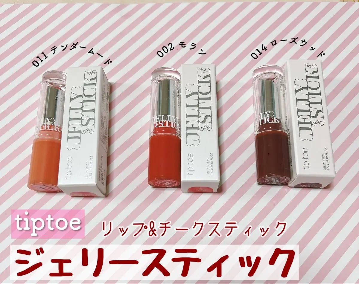 透明感のあるちゅるん感 最近、縦ジワが気になりすぎて😂 そんな唇でもカバーしてくれる← どのカラーも可愛いし、チークとしても使えるからチークとリップカラーを合わせられるよ✊🏻ˎˊ˗ 是非checkしてみてね🤍 ▼━━⺌ tip toe ▫️ゼリースティック