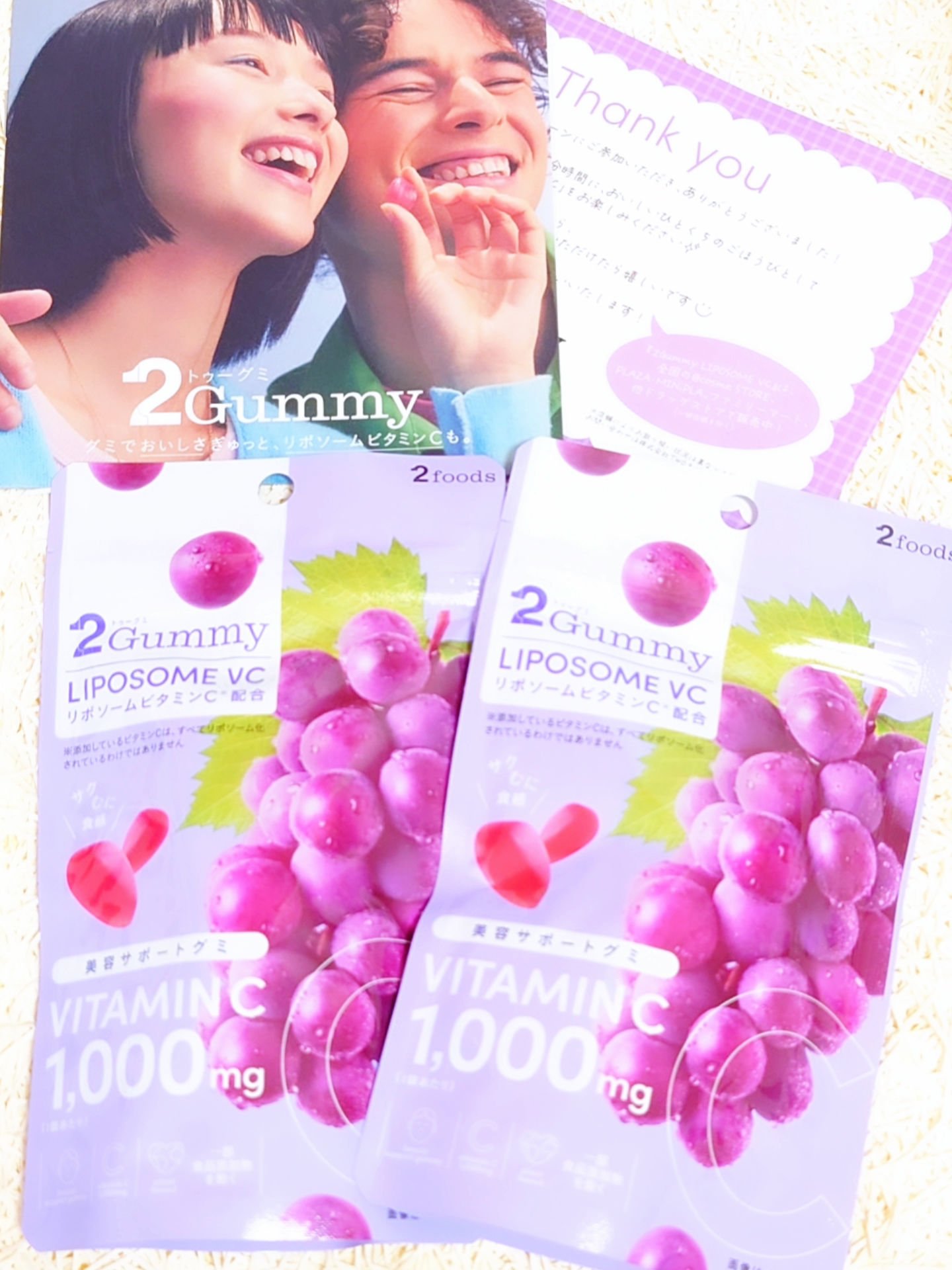- 「食べるリポソームビタミンC」登場。2Gummyは、話題のリポソームビタミンCを配合したグミ。量と頻度に着目し、1袋にビタミンCを1,000mg配合。おやつ感覚で、いつでもどこでもビタミンCをチャージできます。