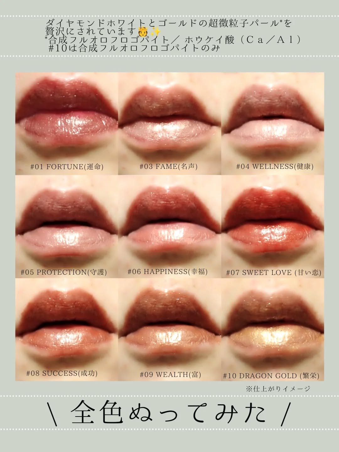 - <商品特長> ●どの角度からも繊細な煌めきを感じる唇へ ダイヤモンドホワイトとゴールドの超微粒子パール*を贅沢に配合。 煌めくグリッターレイヤリングでどの角度から見てもまばゆい輝きを放つ美唇に仕上がります。 グロッシーバームが唇へピタッと密着するため、ひと塗りで立体感のあるボリューミィなぽってり肉厚唇を叶えます。 *合成フルオロフロゴパイト/ ホウケイ酸(Ca/Al) #10は合成フルオロフロゴパイトのみ #10のみダイヤモンドホワイトのラメを使用。 その他の色は、ダイヤモンドホワイトとゴールドのラメを使用しています。 ●透明感あふれるクリアな光沢感 繊細なきらめきとピュアな彩りを叶えるリップカラー。 とろけ出すうる艶感が、グリッターの輝きをさらに美しく引き立てます。 ●リップオイル効果でぷるぷる唇続く 3種のリッチなリップケア成分*を配合。 唇にうるおいを与え、乾燥や皮むけを防ぎながら、しっとりなめらかな仕上がりを叶えます。 べたつかず、たっぷりの水分感を保ちながらも軽さを感じる使用感を実現。 リップクリームのように持続する高い保湿力があり、つけたてのツヤとうるおいを長時間キープします。 ・クルエルティフリー(動物実験をしていない) * シア脂・ババス油・ビタミンE(酢酸トコフェロール)/全て保湿