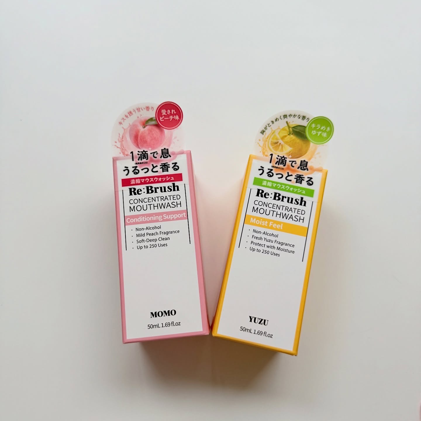 Re:Brush濃縮マウスウォッシュ もも味&ゆず味新フレーバー「ピーチ&ゆず」登場🩷💛ハンドクリームサイズで持ち運びにも最適です。フタがコップとして使えて、わかりやすく水を入れる線まであるのでとても便利✨辛くないマイルドな使用感なので辛いの...