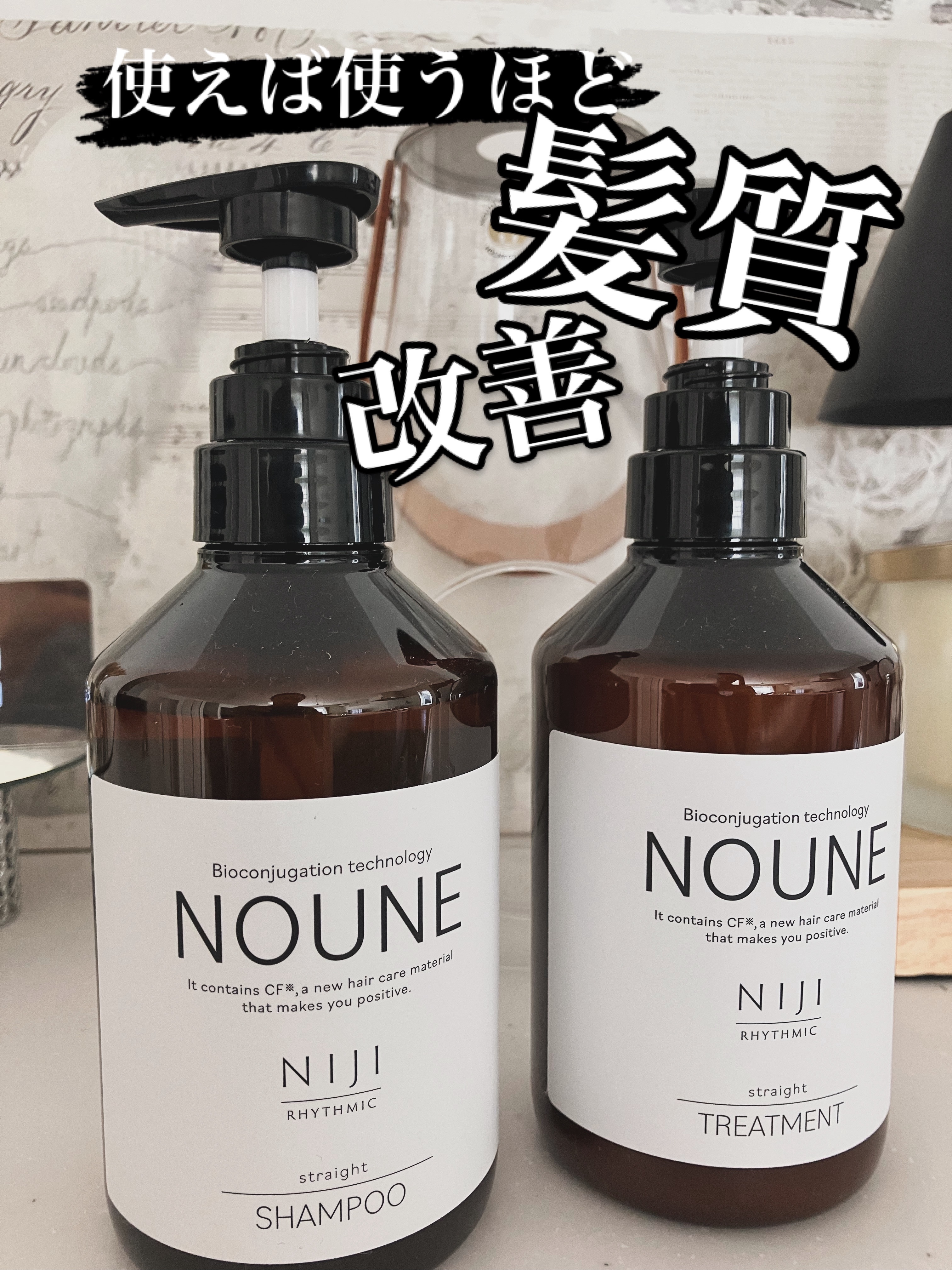 - ヘアケアブランド NIJI<ニジ>リズミック シリーズの NOUNE<ノウネ>ストレートシャンプー/トリートメントです。 トステア(アミノエチルチオコハク酸ジアンモニウム(保湿成分))がドライヤーの熱に反応しすとんとまとまる髪へと導きます。 日本人の70%以上が抱えている、うねりやくせ毛対策*に特化したヘアケアアイテムで毎日の《洗髪して乾かす》だけで簡単にお手入れができます。 こんな方におすすめ! ●うねりやくせ毛が気になる ●ヘアアイロンのダメージが気になる ●朝、準備する時間がない *頭皮・毛髪のうるおいを保つことによる