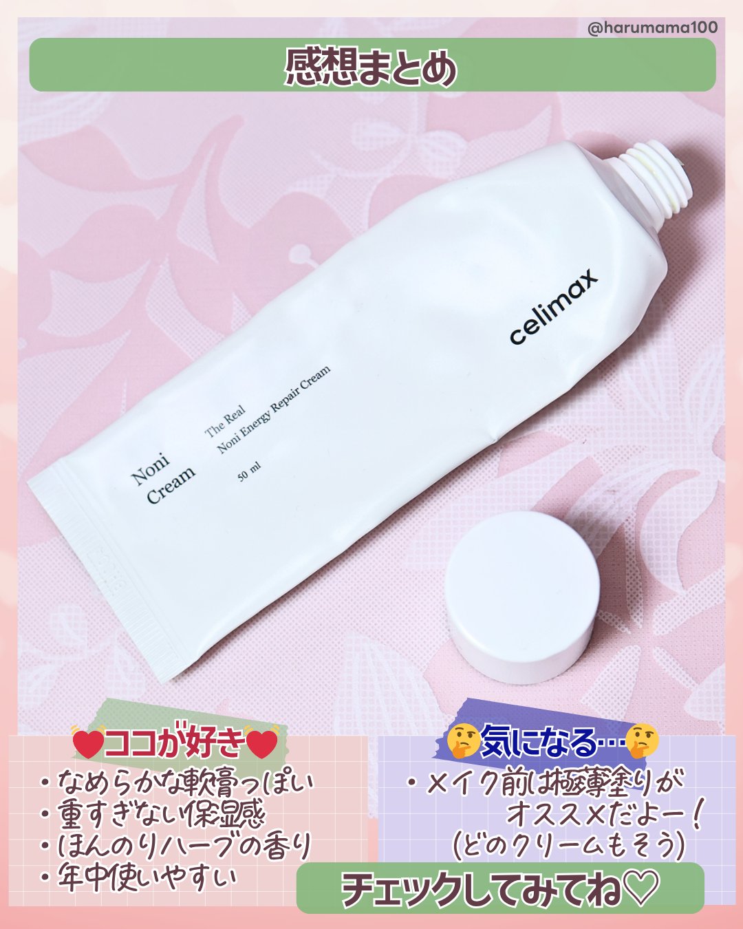 乾燥肌&敏感肌さんの心強い味方!スーパーフードノニのクリーム。以前よりcelimaxのノニアンプルと化粧水は使っていたのですが…今回初めてノニエナジーリペアクリームを使用しました。やはり、期待を裏切りません。ノニエキス65%配合で、鎮静と保湿...