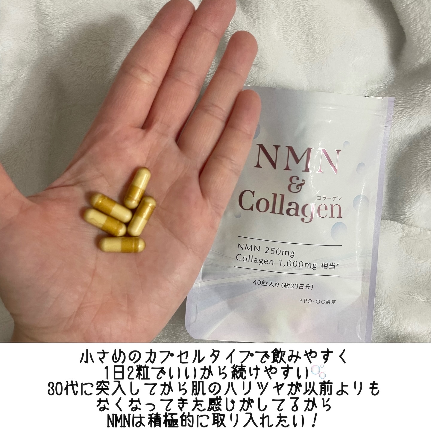 - 2025年、健康志向がますます高まる中、アンチエイジングやウェルビーイングに関心を持つ人々が急増しています。そんな時代のニーズに応えるべく、注目の成分「NMN(ニコチンアミドモノヌクレオチド)」と「高濃度*コラーゲン」を配合したサプリメント「NMN&Collagen」が誕生しました。 NMNは、近年の長寿研究や“サーチュイン遺伝子”との関連性から、世界中の研究機関や専門家の間で注目されている成分です。1日あたり250mgのNMNを配合し、年齢に左右されない活力ある毎日をサポートします。 さらに、コラーゲンは特有のジペプチド(PO・OG)を通常の約30倍含有する高濃度*タイプを採用。 1日あたり1000mgの摂取で、若々しさとしなやかさを内側から支えます。 加えて、ローヤルゼリーやエラスチンなどの美容成分も贅沢に配合。「NMN&Collagen」は、外見だけでなく、内面からの美しさと健康を追求する方にぴったりのサプリメントです。 * PO・OGを通常の約30倍含有