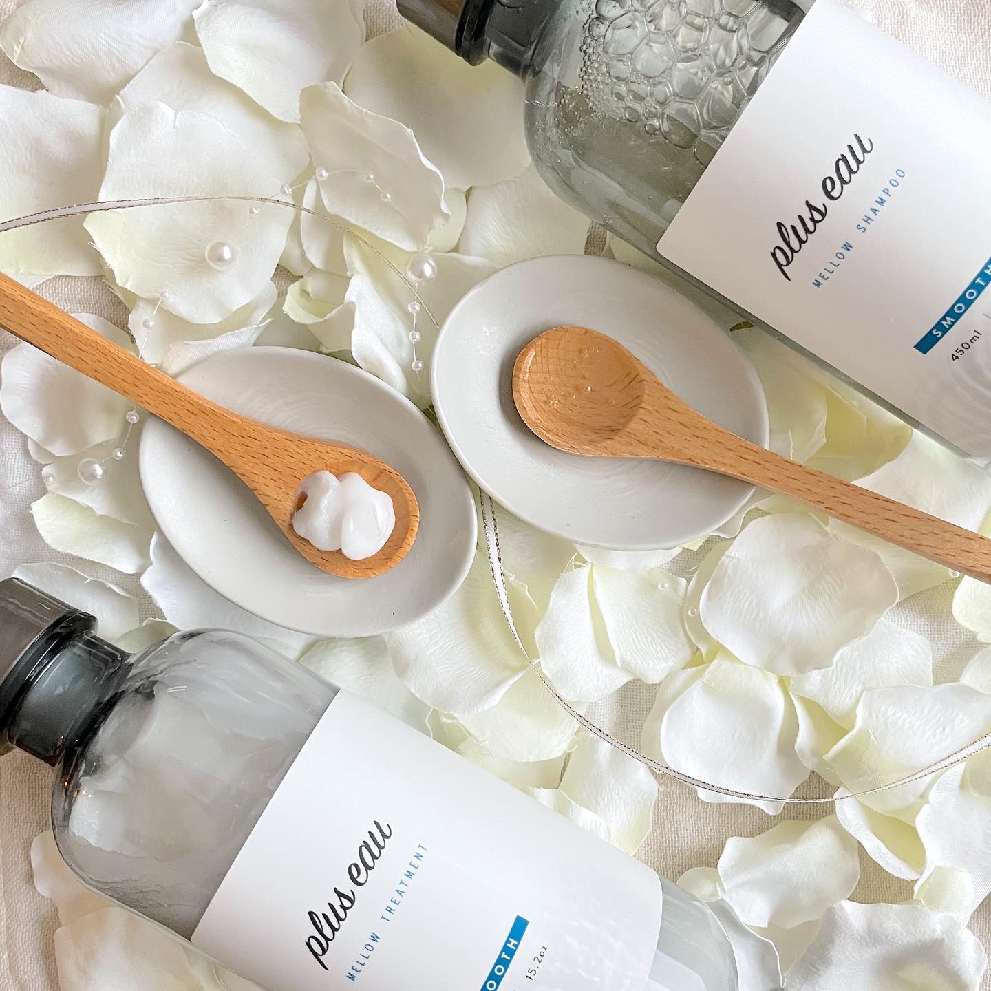 サロンでしか感じられない、仕上がりや質感を毎日のホームケアで実現する「サロン品質」にこだわったヘアケアブランドの「plus eau」さん。 繰り返すカラーや熱ダメージによるパサつきや広がり・ゴワつきなどの蓄積ダメージにもしっかりアプローチして、補修美容でさらツヤ・うるツヤ髪に導く美容液シャンプー&浸透補修トリートメントです。 メロウシャンプークリアでサラサラとややトロミがある滑らかなテクスチャー。とっても泡立ちが良いです! メロウトリートメント白くぽってりと濃厚で、髪に馴染ませやすく潤いを感じるテクスチャーで、保湿効果を期待できそう! 清楚な上品さを纏う「ホワイトフローラル&ペアーの香り」の香りが良くて、洗っている間も癒しタイムなのですがドライ後も良い感じです。 髪が落ち着いて見えるし、スタイリングもしやすい◎香りの持続力が素晴らしくて髪を動かしたくなります。