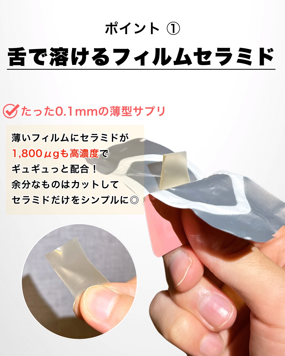 - ● 1枚に米由来セラミド1,800μgを高濃度で配合 ● わずか0.1mmの厚さで、口内ですーっと10秒で溶ける ● 個包装タイプで外出先でもスマートに摂取可能 ● 1日1枚を目安に毎日の美容習慣に