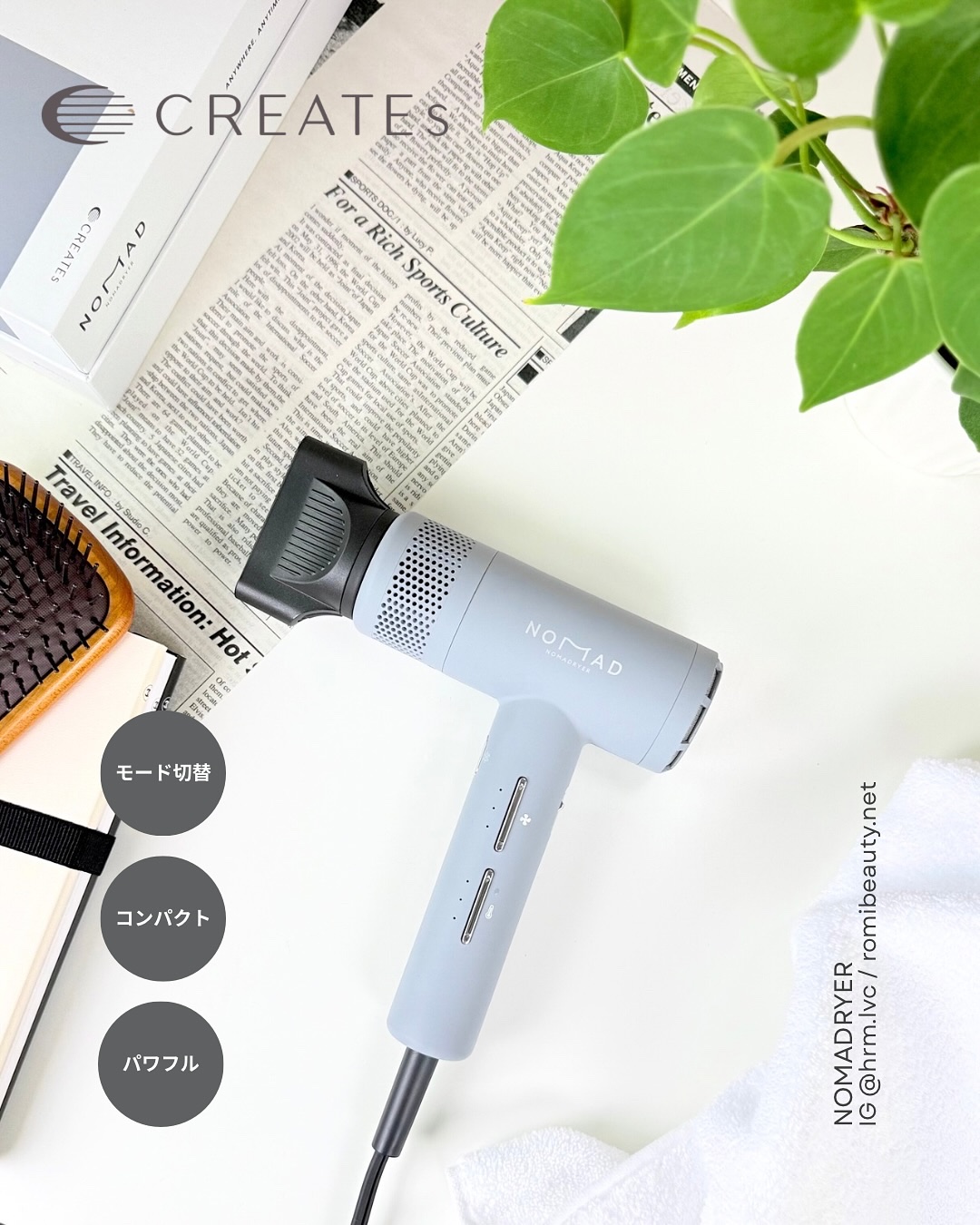 - ノマドワーカーのような、場所や時間にとらわれないライフスタイルにインスパイアされ“コンパクトなのに、確かな性能”を備えた、ノマドライヤー(NOMAD+DRYER)が誕生。「ドライヤーは、自宅で使うもの」という常識を超えて、どこへでも気軽に持ち歩けて、お気に入りの仕上がりを実現できます。約290g(コード・ノズルを除く)の軽やかなボディからは想像できないパワフルな風量・静音・美髪ケアを兼ね備え、うるおい感を守りながら、スピーディにドライ。