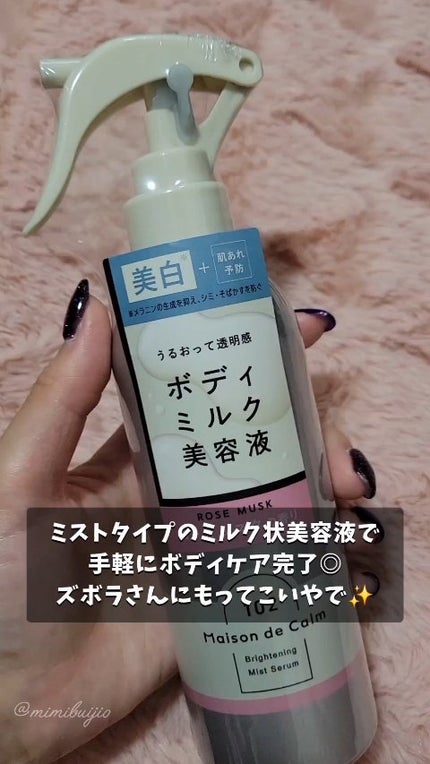 忙しくてもボディまで美白*ケア♡メゾンドカームブライトニングミストセラム販売名:薬用美容液W7a【医薬部外品】全身ささっと浴びて潤いケアできるミストセラム🥰一回のプッシュ出る量が多めで逆さにしてもしっかり出てくれるので全身にとっても塗りやすい...