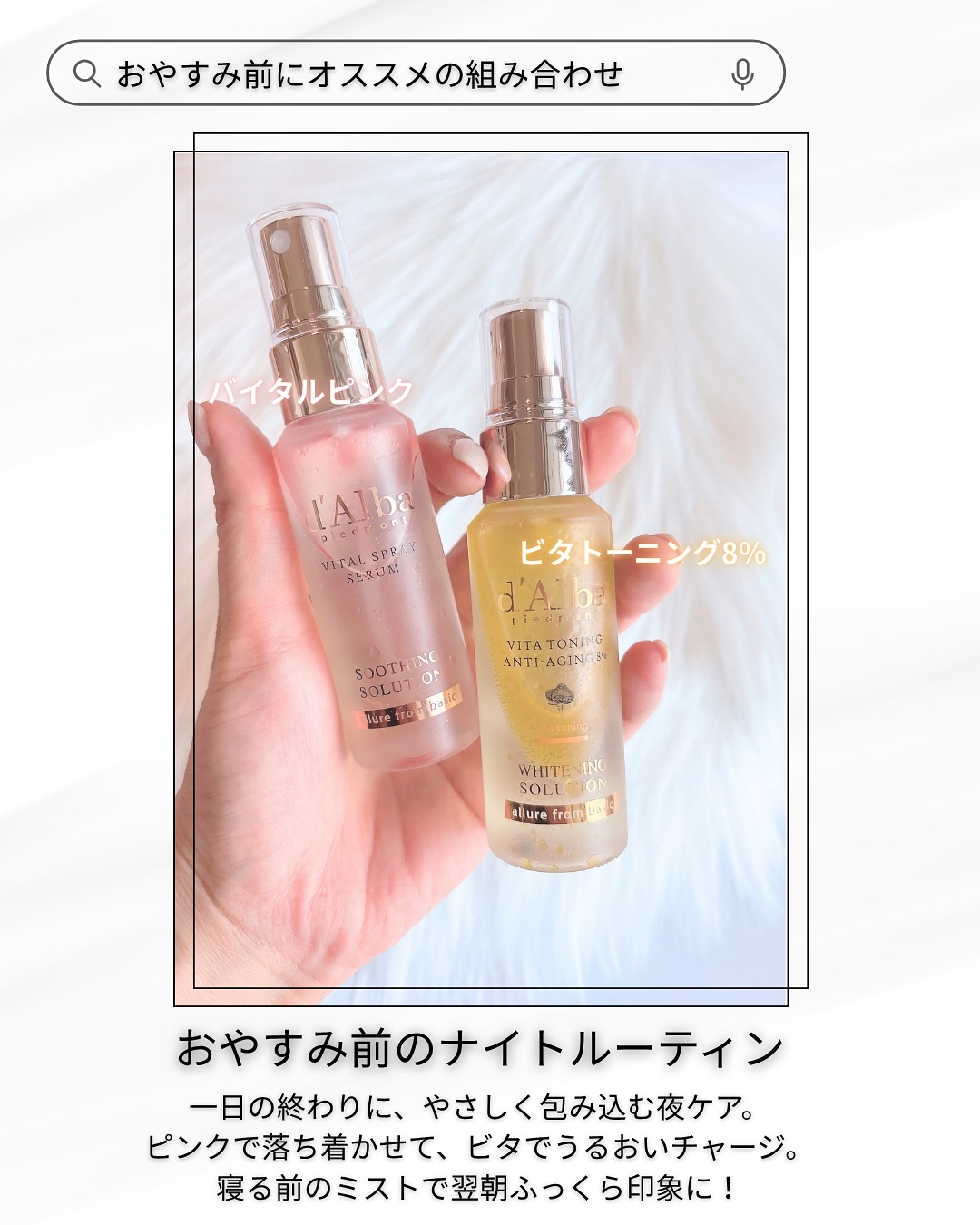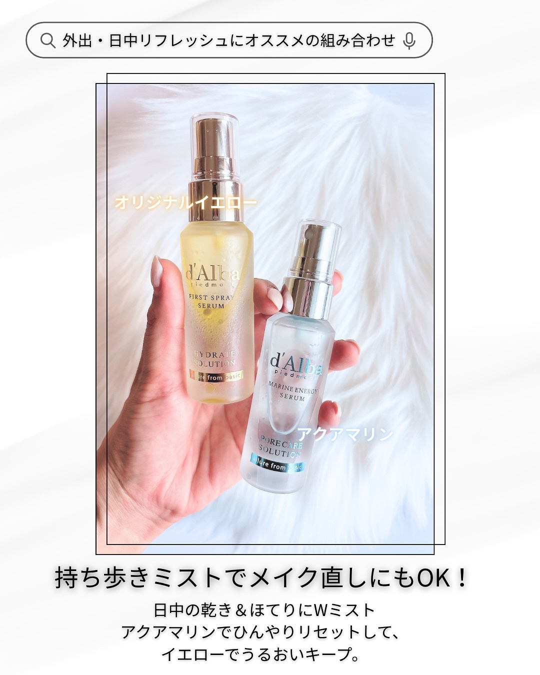.💛d’Albaミストの“使い方レシピ帳”💛1本ずつでも、混ぜても。肌が変わる🕊️まずは、1本ずつのレシピから✨🍋ファーストスプレーセラム▷朝のメイク前にシュッ 水分と油分のバランスを整えてメイクのりUP 日中の乾燥にも頼れる万能ミスト💛🌸バ...