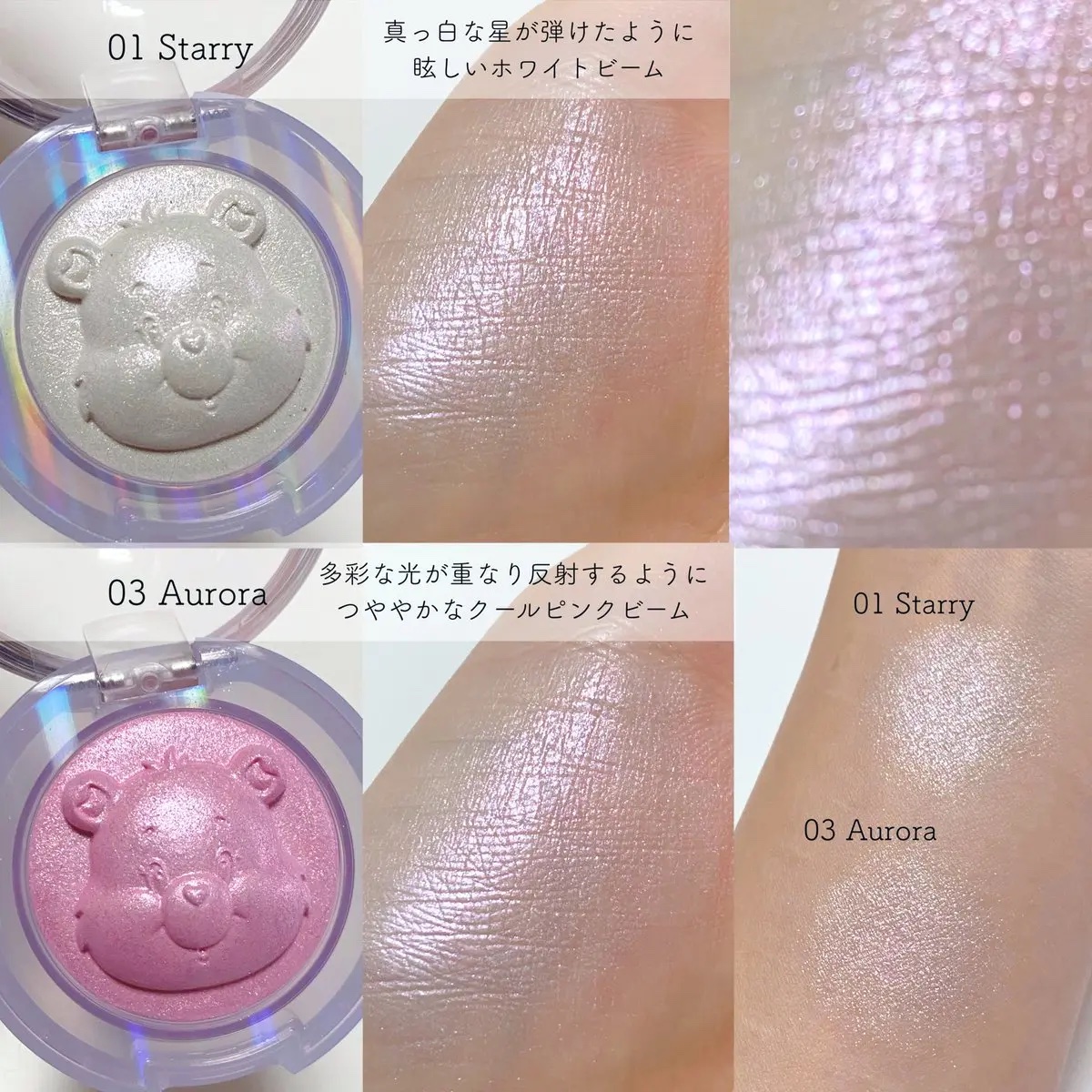 TAGスターリットビームライターぽんっとつける瞬間、あふれる立体感!✨夢の中でも光る星屑のようなハイライト🌙さくさく細かい星屑のように降り注ぐスターリットグリッターと、天の川のように繊細に輝くシマーグリッターが綺麗〜🤩ケアベアの柄がハイライタ...