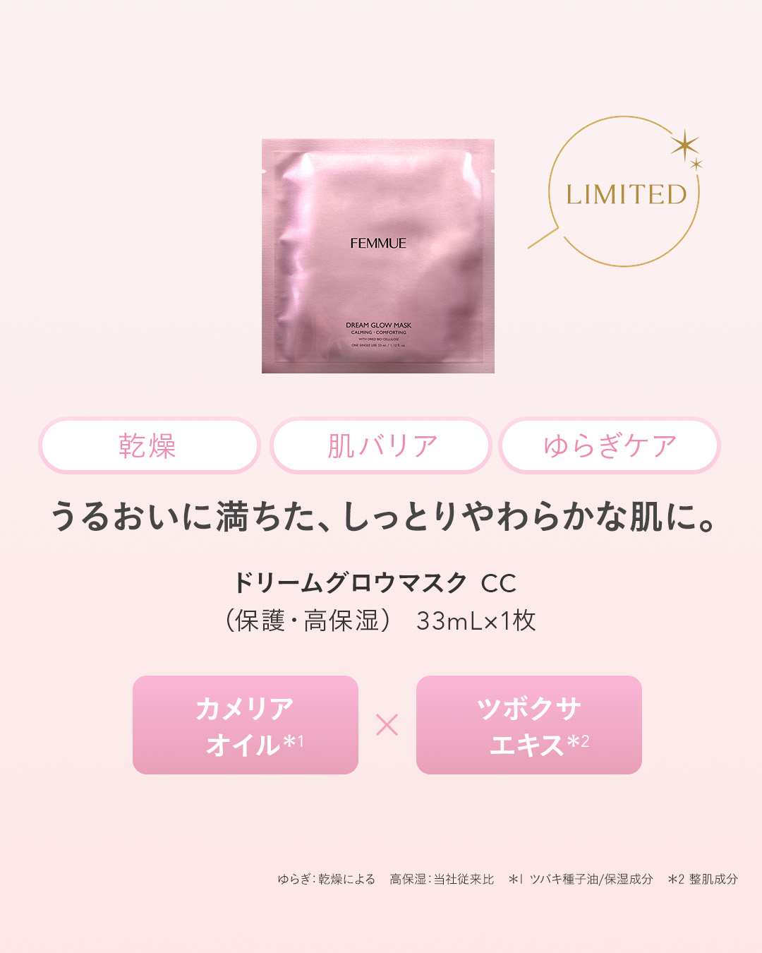- 【2025クリスマスコフレ】〈数量限定〉 POINT1. 心地よい密着感と美容成分で肌を包み込むFEMMUE人気No.1カテゴリーのシートマスク5種を詰合わせ 花々の恵みや美容成分を惜しみなく肌へ届ける〈ドリームグロウマスク〉4種×1枚と、〈ルミエール ヴァイタルマスク〉1枚入り。5種のマスクを体験できるので、贈り物としてはもちろん、さまざまな種類をお試ししたい方にもおすすめです。 POINT2. 毛穴やくすみにアプローチする〈ルミエール ヴァイタルマスク〉がリニューアルして登場! 乾燥によるくすみや毛穴をケアして、肌本来の光を放たせる、人気の「ルミエールライン」。その主役であり、ビタミンCを安定して肌に届けるビタミンC誘導体*3を筆頭に、透明感*1を出すナイアシンアミド、みずみずしさを保つMada Snow(マデカッソシド)、キメを整えるPHA*4などを配合した美容液を独自の素材に浸した、特別なシートマスクが本セット限定で新登場。 *限定パッケージ入り 〈セット内容〉 ・ルミエール ヴァイタルマスク クリア肌*1・キメ・角質ケア/32mL×1枚 (本セット限定) ・ドリームグロウマスク(CC)保護・高保湿*2/33mL×1枚(本セット限定) ・ドリームグロウマスク(RR)透明感*1・キメ/32mL×1枚 ・ドリームグロウマスク(PF)ハリ・ツヤ/32mL×1枚 ・ドリームグロウマスク(HR)保水・保湿/32mL×1枚 2025年11月1日(土)数量限定発売