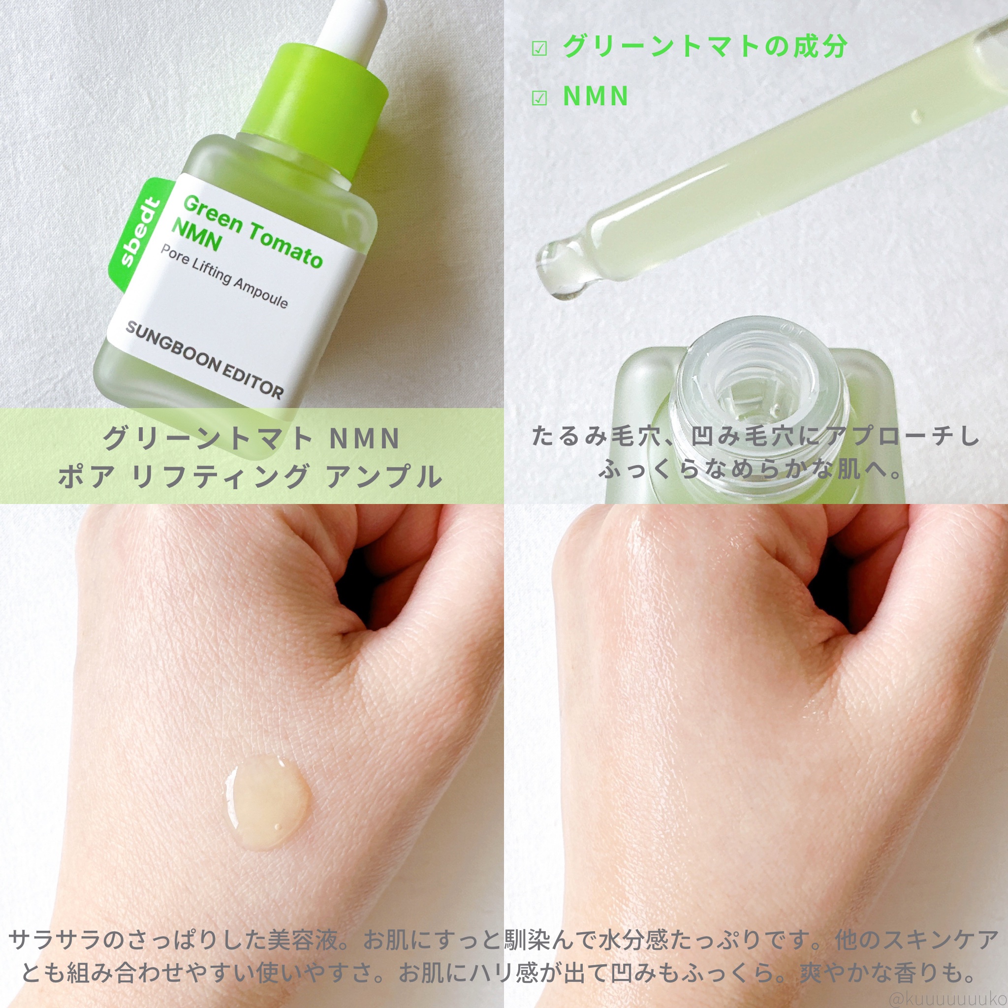 SUNGBOONEDITOR成分エディターグリーントマトNMNポアリフティングアンプル成分エディターの技術で厳選成分を凝縮毛穴にしっかりアプローチ✨毛穴よりも小さい4~6nmの超微細ナノサイズで肌への吸収率と角質層への浸透が高め、肌の奥まで届...