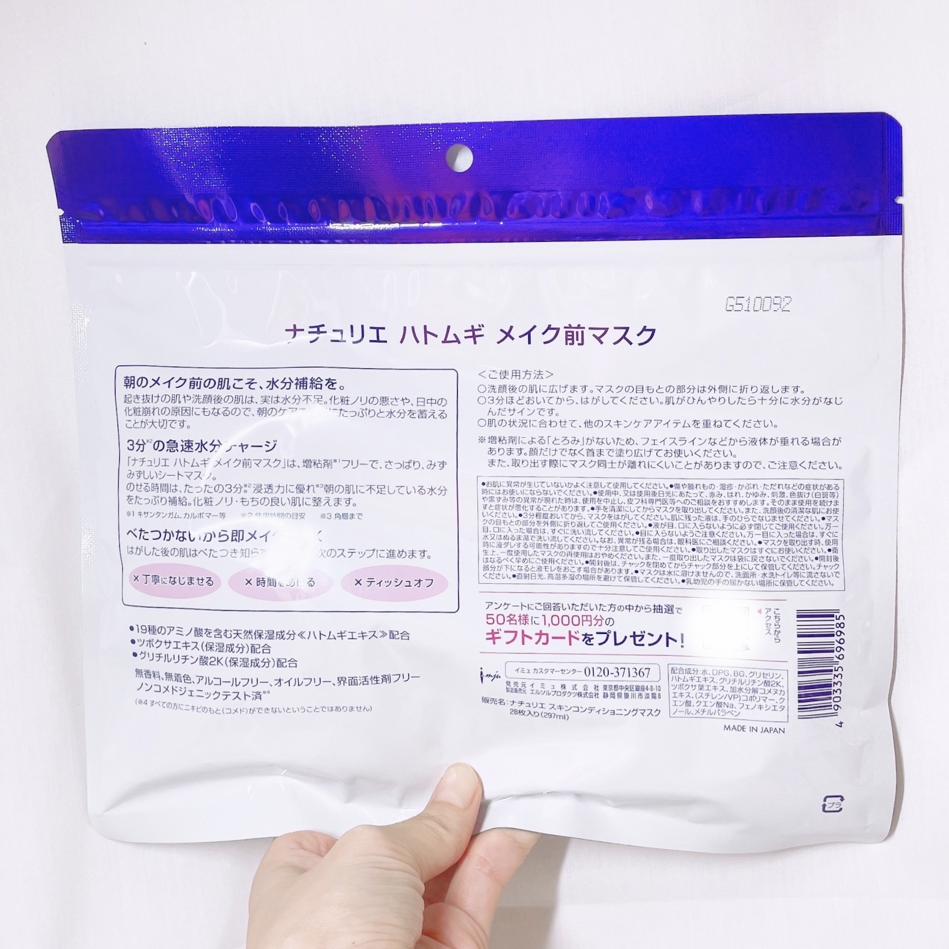 ナチュリエさまからいただきましたナチュリエハトムギメイク前マスク28枚入り朝3分の急速水分チャージで化粧ノリ·モチUP!増粘剤フリー*さっぱりしていてメイク前でも使いやすいマスクです洗顔後に使ってお好みで美容液や乳液を追加即メイクもできます!...