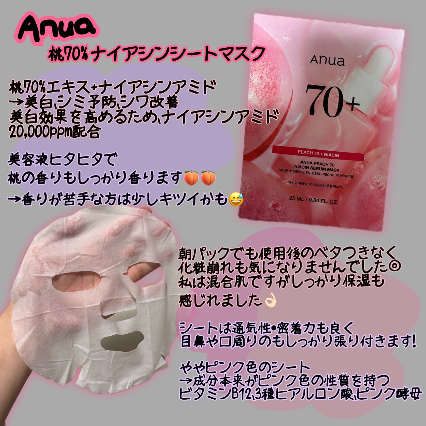 💓最近人気のアヌアのマスクパック💓Anua桃70ナイアシンセラムマスク7枚入使ってみたよ😍😍😍🤍⋅.˳˳.⋅ॱ˙˙ॱ⋅.˳˳.⋅ॱ˙˙ॱᐧ.˳˳.⋅⋅.˳˳.⋅ॱ🤍Anua桃70ナイアシンセラムマスク7枚入桃70ナイアシンセラムの美容液が...