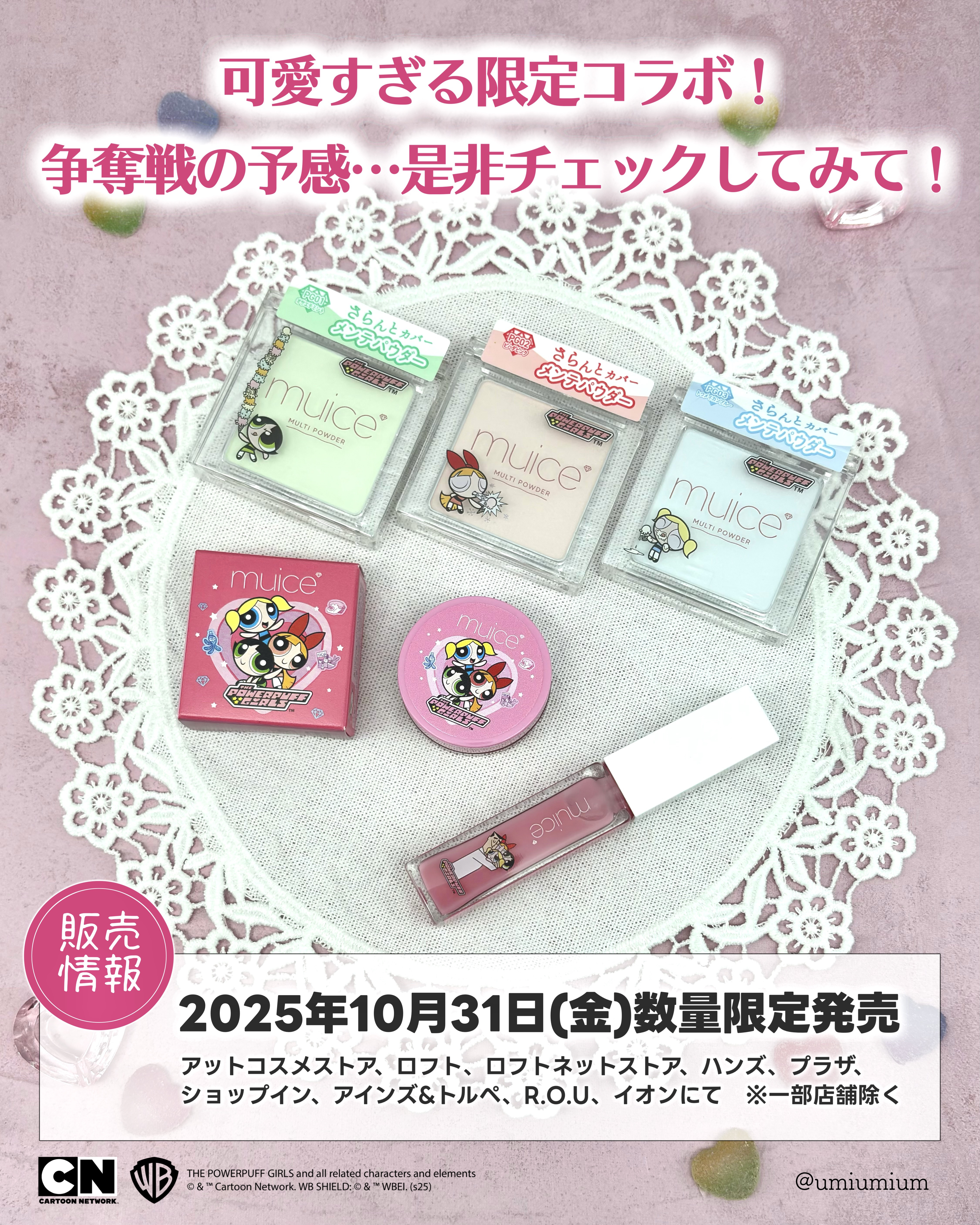 「muice(ミュアイス)」×「パワーパフガールズ」の限定コラボアイテムが登場💗⚜️muiceスフレdeチークPG01ピンクチェリーボムスポットメンテパウダーPG01オサエテミント/PG02ビハダピンク/PG03トウメイカンブルーちゅるリップ...