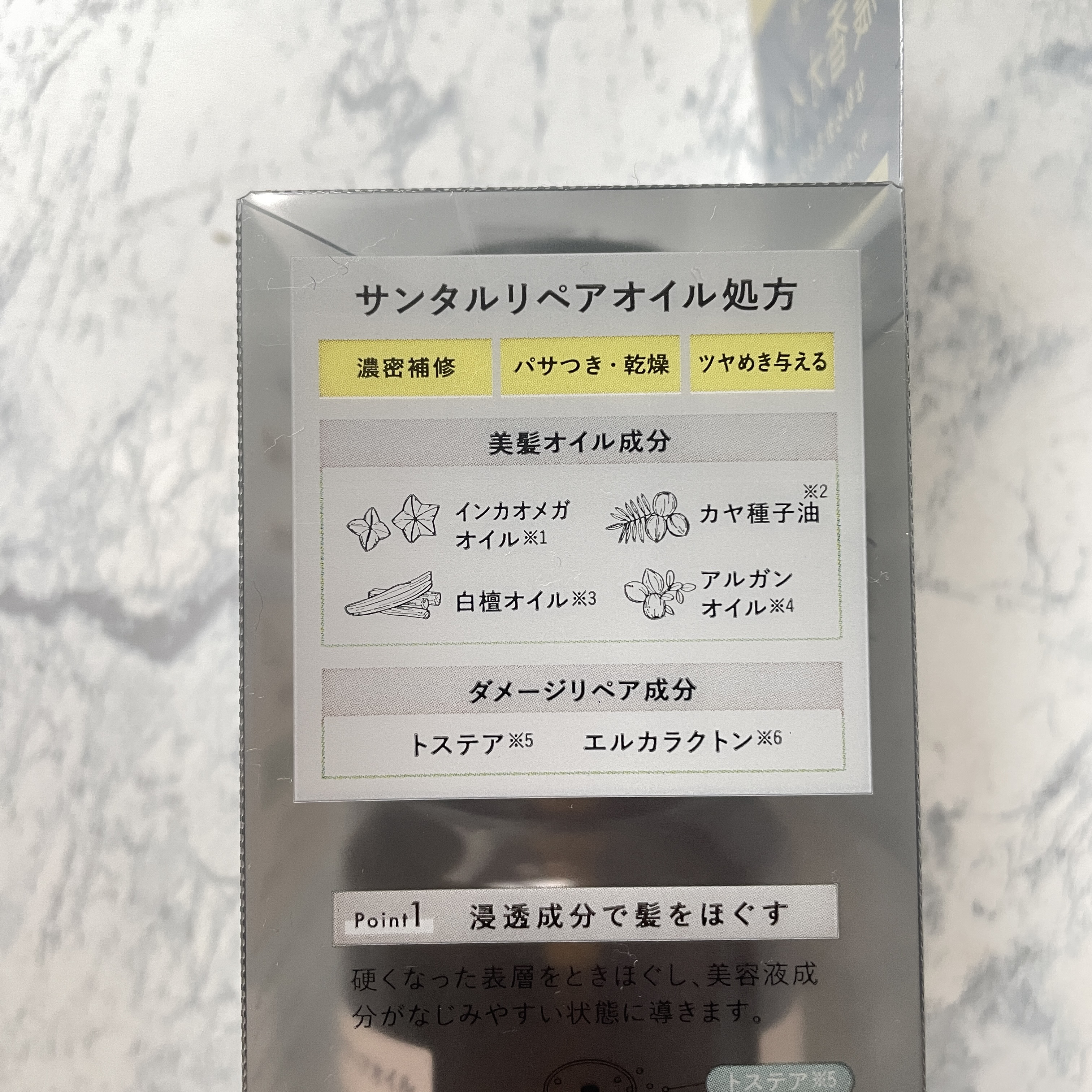 - 濃香オイル配合。 ・髪のパサつき やツヤ不足、カラー・摩擦・熱などによるダメージ髪の絡まり・きしみ髪を 濃密補修し、パサつき・乾燥をケアしツヤめき与える。 ・べたつかず、さらさらな指通り 【サンタルリペアオイル処方×パロサントの濃香な香り】 〇サンタルリペアオイル処方 ・植物由来の成分でダメージホールを補修、キューテイクルをラッピングし、毛髪を保護する美髪成分 (インカオメガオイル※1、カヤ種子油※2、白檀オイル※3)と 浸透成分で髪をほぐす硬くなった表層をときほぐし、美容液成分がなじみやすい状態に導くトステア※4、 美容液成分が浸透し、毛髪内部まで集中補修エルカラクトン※5、 髪の表面をつつみこむようにコートし、傷んだキューティクルを密着補修するアルガンオイル※6などのダメージケア成分を配合。 〇パロサントの濃香な香り ・目を瞑ると静寂が広がる奥行きのあるほのかな甘さと、木の温もりを感じる香りの中に浸されるパロサントとサンダルウッドの香り。 ※1 プルケネチアボルビリス種子油(保湿成分) ※2 保湿成分 ※3 ビャクダン油(保湿・香り成分) ※4 アミノエチルチオコハク酸ジアンモニウム(毛髪補修成分) ※5 γ-ドコサラクトン(毛髪補修成分) ※6 アルガニアスピノサ核油(保湿成分)