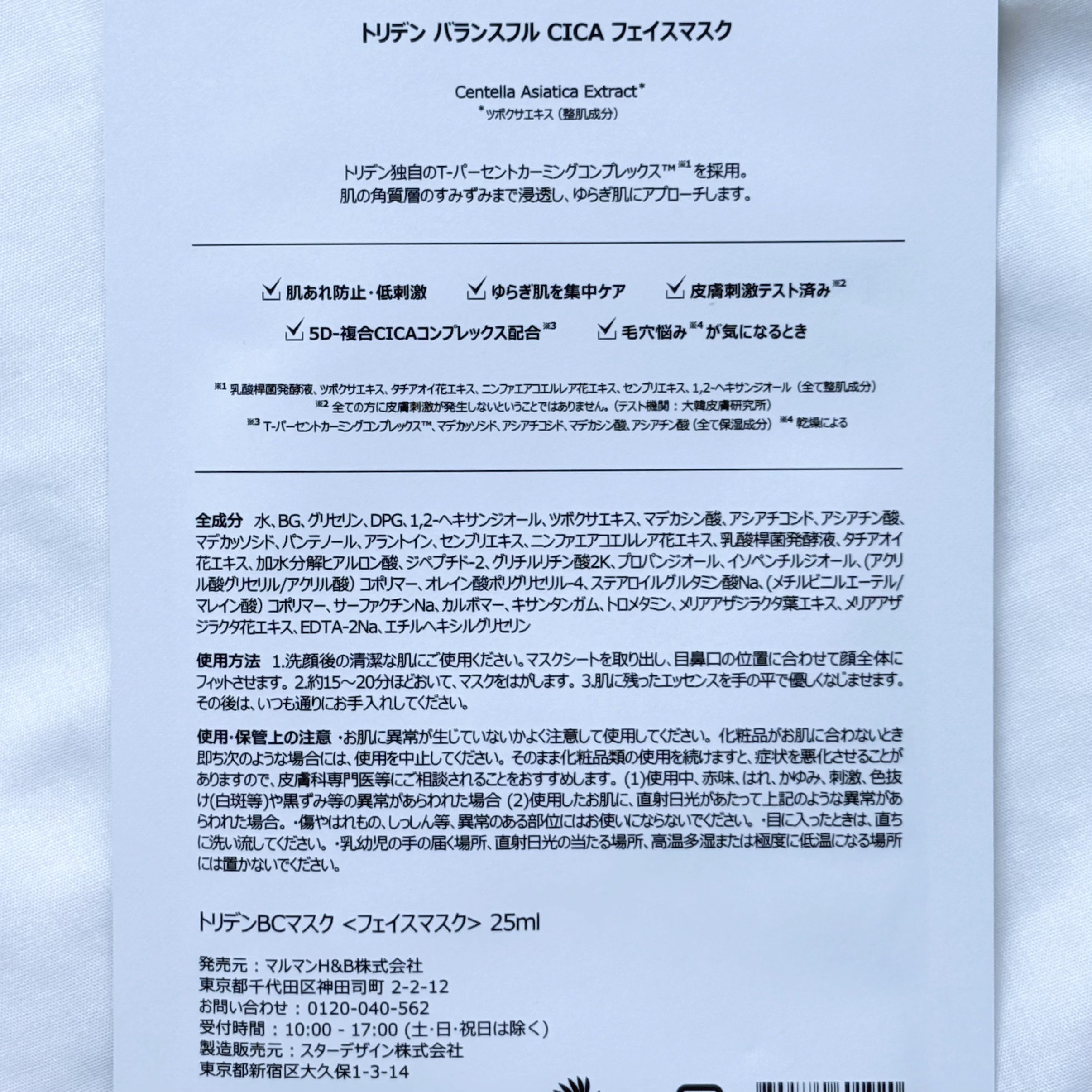 - つけた瞬間にぴたりと密着!ゆらぎ肌へ集中CICAケア。 美容液をたっぷり含んだ薄くて丈夫なヴィーガン認証シートが肌に密着。 トリデン独自の5D-複合シカコンプレックス※が肌の角質層まで浸透し、 皮脂・整肌ケアをサポートします。 ※トリデン独自のT-パーセントカーミングコンプレックス(乳酸桿菌発酵液、ツボクサエキス、タチアオイ花エキス、ニン ファエアコエルレア花エキス、センブリエキス、1,2-ヘキサンジオール / 全て整肌成分)、マデカッソシド、アシアチコシド、マデカシン酸、アシアチン酸、アシアチン酸(全て保湿成分)