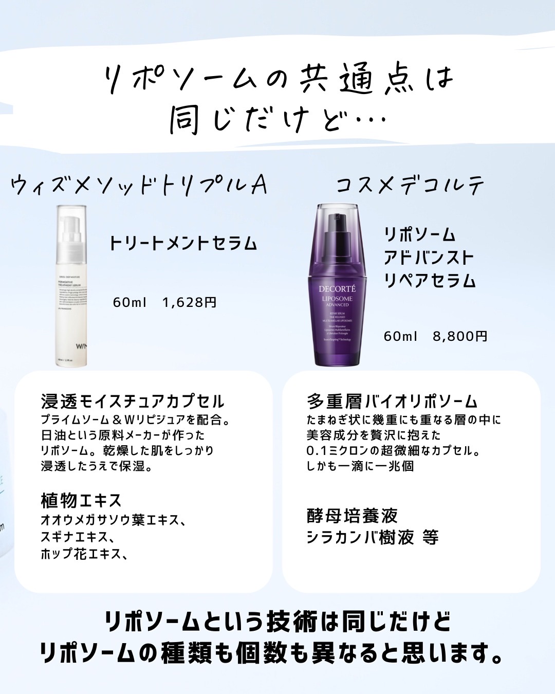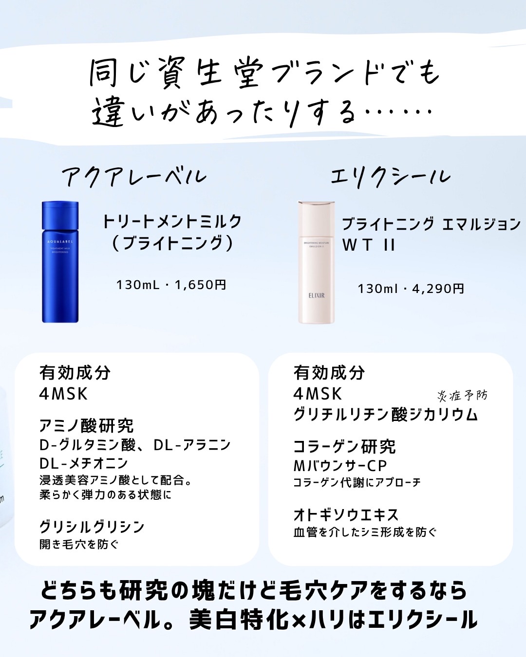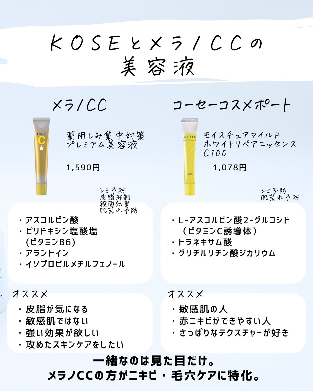 特定の有効成分を試してみたい。美容成分を試したい。そんな時は代用してもいいけど、それって似てるのかな?って思うときが正直ある。 同じ成分があっても実は濃度が違ったり、処方技術が違ったり。技術が違うと使用感も剤型も変わることがあることは知ったうえで使うといいかも。 せっかくプチプラ化粧品を買うならそれはそれで楽しんでほしいから是非念頭にいれてほしいな!!