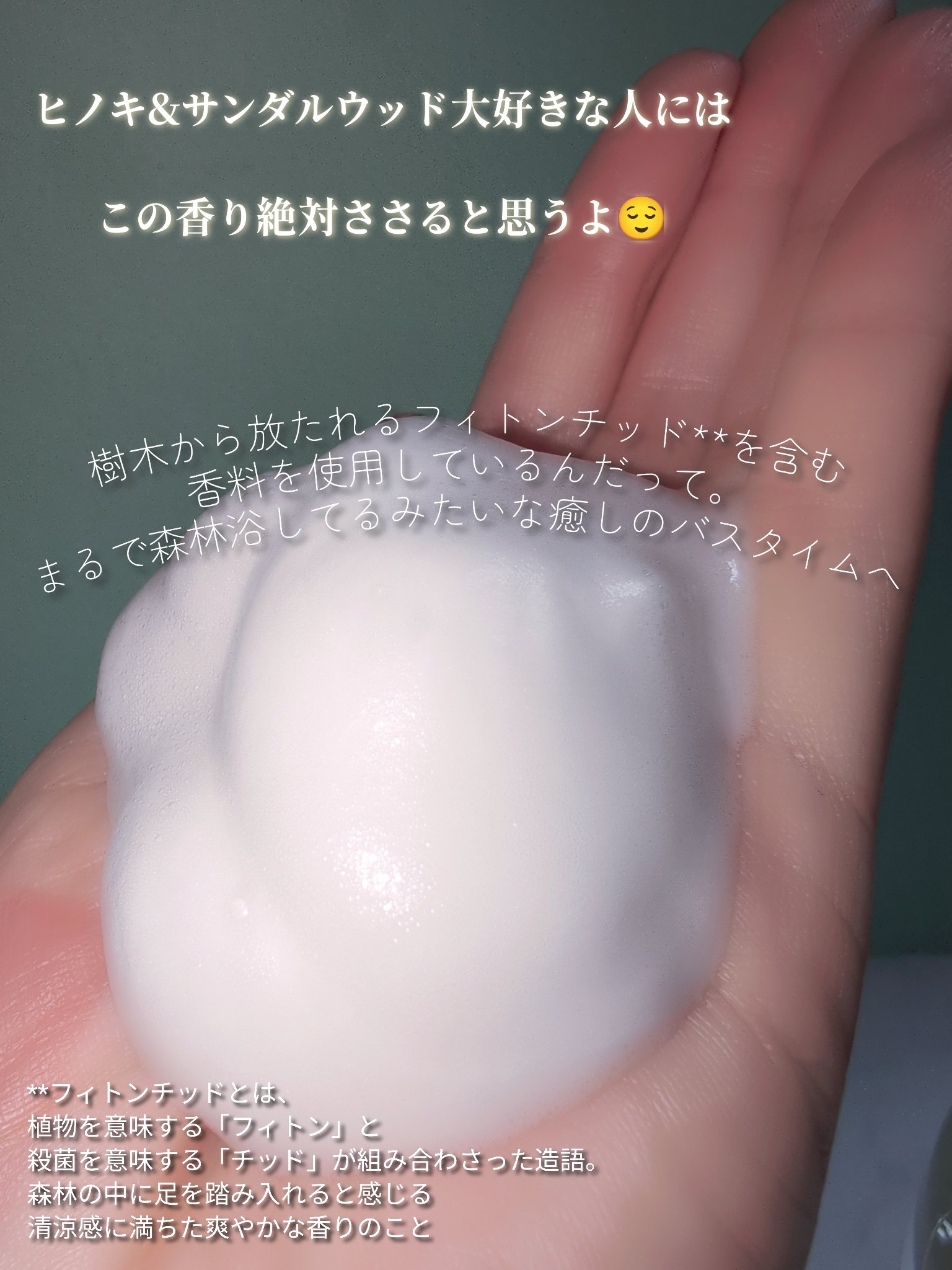 - ボタニストの泡ボディーソープがリニューアル 「潤い満ちた泡続く 森林浴香る」 へたりにくい3倍泡※1で優しく洗う たっぷり続く潤い満ちた泡でしっとり肌へ 無添加 アルコール、パラベン、合成着色料、サルフェートフリー※2 ①香り高い国産ヒノキ精油を配合したダブルフレグランス ヒノキとサンダルウッドの香り 樹木から放たれるフィトンチッドを含む香料を使用 ②たっぷり3倍泡※1 1プッシュ量が3ccにリニューアル。へたりにくく潤い満ちた泡続く。 ③浸透※3 保湿で肌に潤い優しく洗う濃密泡 肌なじみのよいリキッドシアバター※4 配合 ④優しく洗う濃密泡 こすらず洗えて肌に優しい。植物由来洗浄成分※5配合 ⑤ボディーソープシリーズ共通成分配合 植物由来の保湿成分"ボタニカルバターミルク®" で潤いキープ シアバター※6 、カカオバター※7、ムルムルバター※8 、ココナッツミルク※9 、アーモンドミルク※10 ※1 従来品と比較した1プッシュあたりの泡量 ※2 硫酸系界面活性剤不使用 ※3 角質層まで ※4 シア脂油(保湿成分) ※5 ミリスチン酸、ラウリン酸、ラウリルベタイン(すべて洗浄成分) ※6 シア脂 ※7 カカオ脂 ※8 アストロカリウムムルムル種子脂 ※9 ヤシ油 ※10 アーモンド油(すべてエモリエント成分)