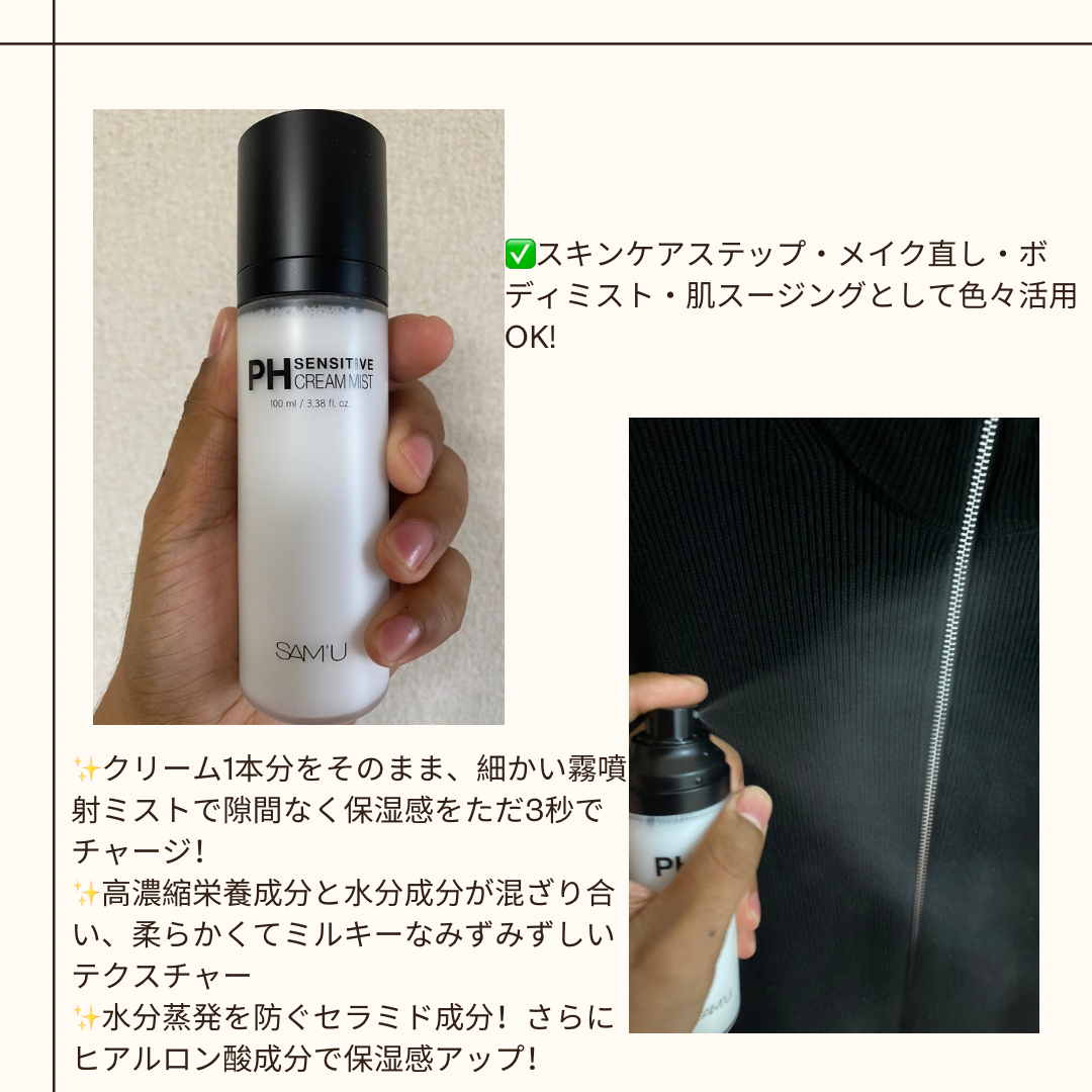 【クリームミスト】これからの時期持ち歩きたくなるこれっ!✔️PHSENSITIVECREAMMISTSAM'U@sam_u_jpサミュのこのシリーズめちゃくちゃ好きだしヘビロテで愛用してるんだけどほんっとに香りが好きなの🥰敏感肌の私の肌にも優...