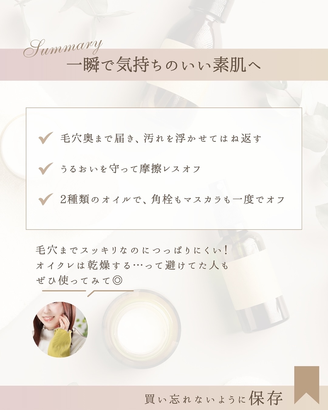 - 洗浄力と保湿力を両立した至福のクレンジングオイル。 日本初の超微粒子技術*が 毛穴の中の微細な汚れにアプローチ。 * ポーラ化成独自の(C12-20)アルキルグルコシド(保湿)で形成するミセルから、 汚れをはね返す水の膜をつくる技術が日本初(2024年12月時点、J-GLOBALによる自社調べ)