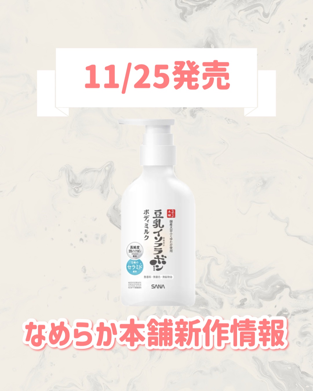 - 数量限定発売 なめらか本舗独自開発の高純度豆乳イソフラボン*¹ と豆乳発酵液*¹ を W で配合し、豆乳の魅力がギュッと詰まったボディミルクです。すぐ服を着ても不快感が無い質感を目指した処方設計で、ベタつかずに全身もちすべ肌へ導きます。美容液成分*²93%配合。うるおいをまもる 5 種のセラミド*³、尿素*¹ のほか、お肌を整えるグリチルリチン酸 2K*¹、アラントイン*¹ を配合しました。 お肌のことを考えた無香料、無着色、無鉱物油。パッチ試験済み、アレルギー試験済みです(すべての方に皮フ刺激やアレルギーが起きないわけではありません)。まるで豆乳のような、さらっとお肌にとけこむようにうるおう心地良い質感で、乾燥が気になる時期にぴったりのアイテムです。 *¹ 保湿成分 *² 保湿成分(油性、水性)、水 *³ セラミドEOP、セラミドNP、セラミドAP、セラミドEOS、セラミドNS(すべて保湿) *⁴ 豆乳成分配合のセルフスキンケア市場 店頭売上金額 2024 年 小売店 5 社 POS データ *⁵ 2004~2025 年 8 月までの累計販売個数 *⁶ 角層まで *⁷ 水酸化レシチン(保湿成分)