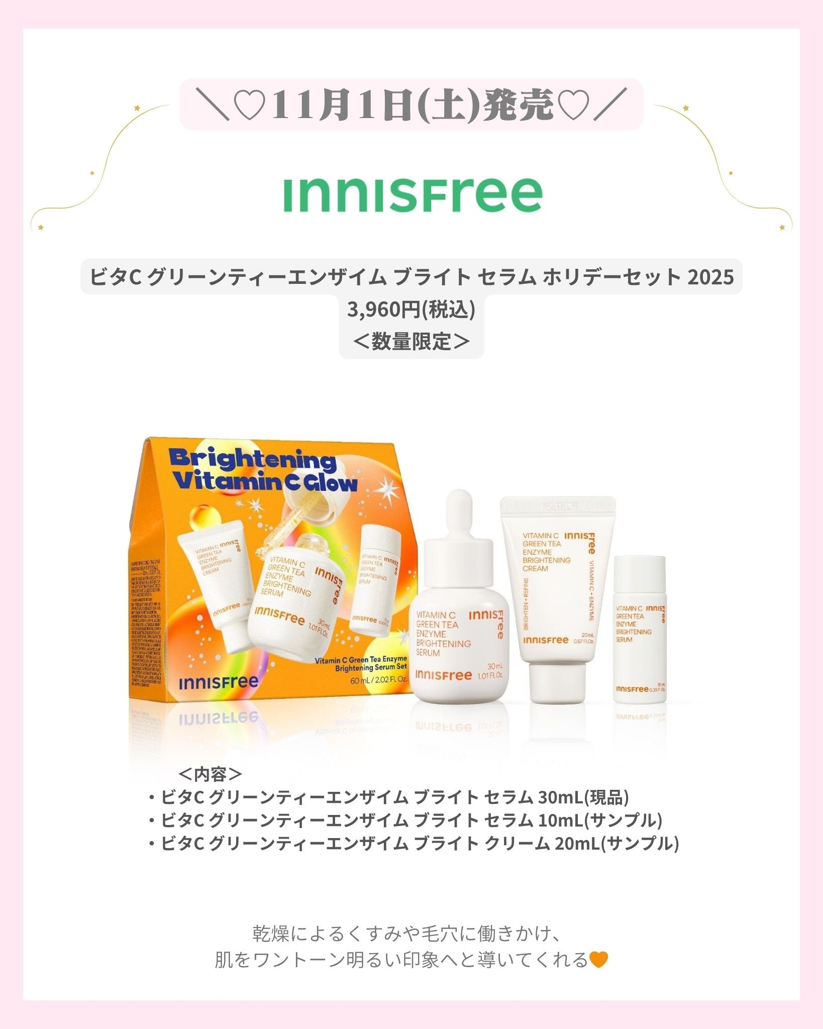 .innisfreeããã¯ãªã¹ãã¹ã³ãã¬ãç»å Žð11æ1æ¥çºå£²â€ã»ã¬ãããŒã«PDRNã¢ããã³ã¹ãã»ã©ã ããªããŒã»ãã20254,400åïŒæ°ééå®ïŒã»ãã¿Cã°ãªãŒã³ãã£ãŒãšã³ã¶ã€ã ãã©ã€ãã»ã©ã ããªããŒã»ãã20253,960åïŒæ°ééå®ïŒã»...