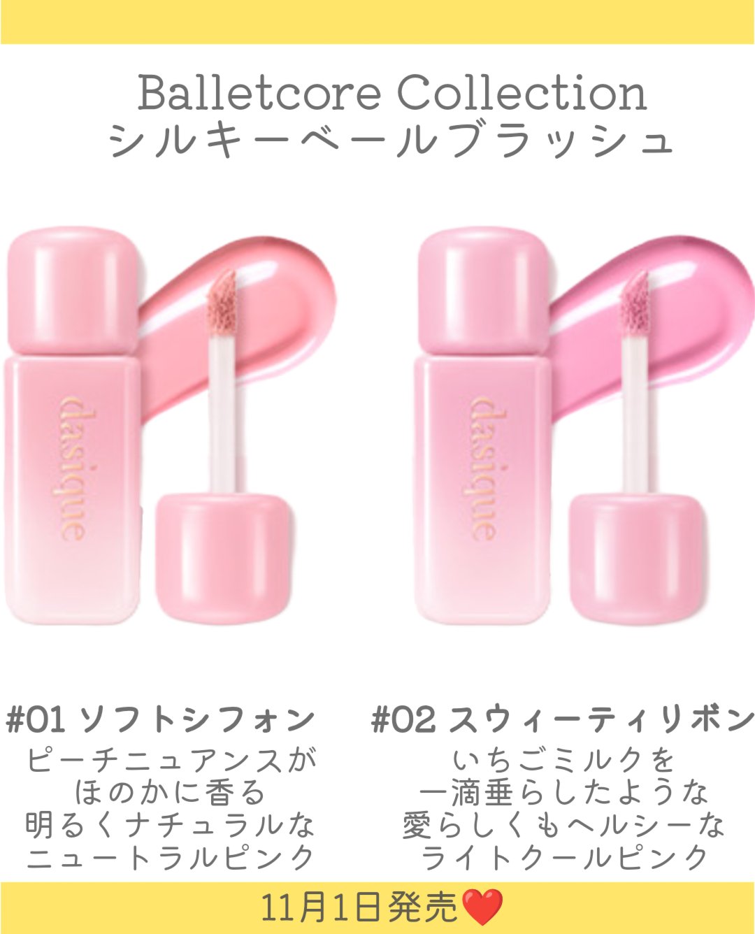 dasiqueバレエコアコレクション🩰バレリーナの優雅なシルエットと魅惑的な雰囲気を表現したピンクカラーのバレエコアコレクション🎀シルキーベールブラッシュとマルチクワッドアイシャドウは新作アイテム!カラーもパッケージも毎回可愛い…🥺💗11月1...