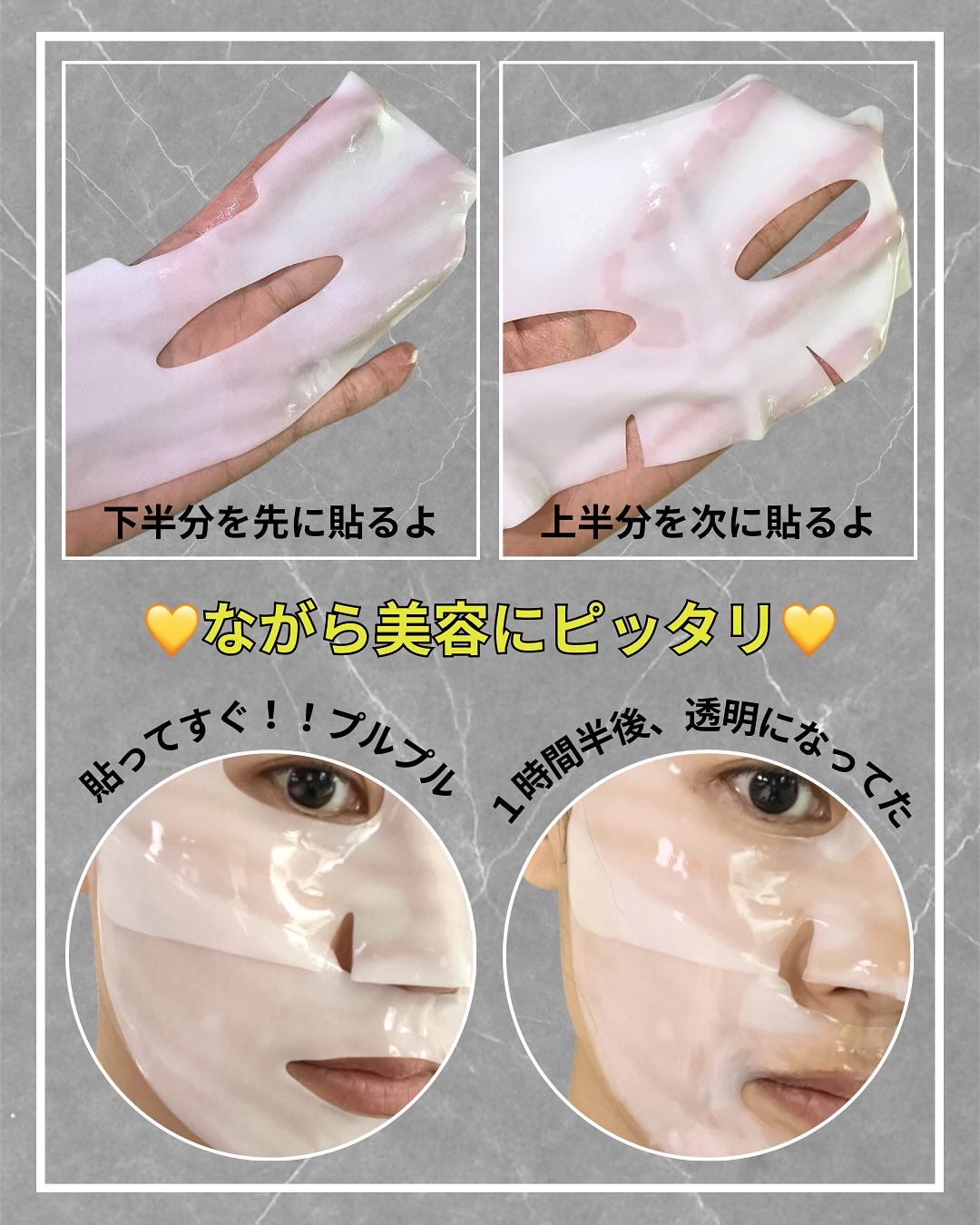 | プルプルのシートマスクです。めちゃくちゃ気持ちいい肌触り!顔の上下でシートが分かれていて、ピッタリとお肌に張り付きます。 | 詳細を見る |