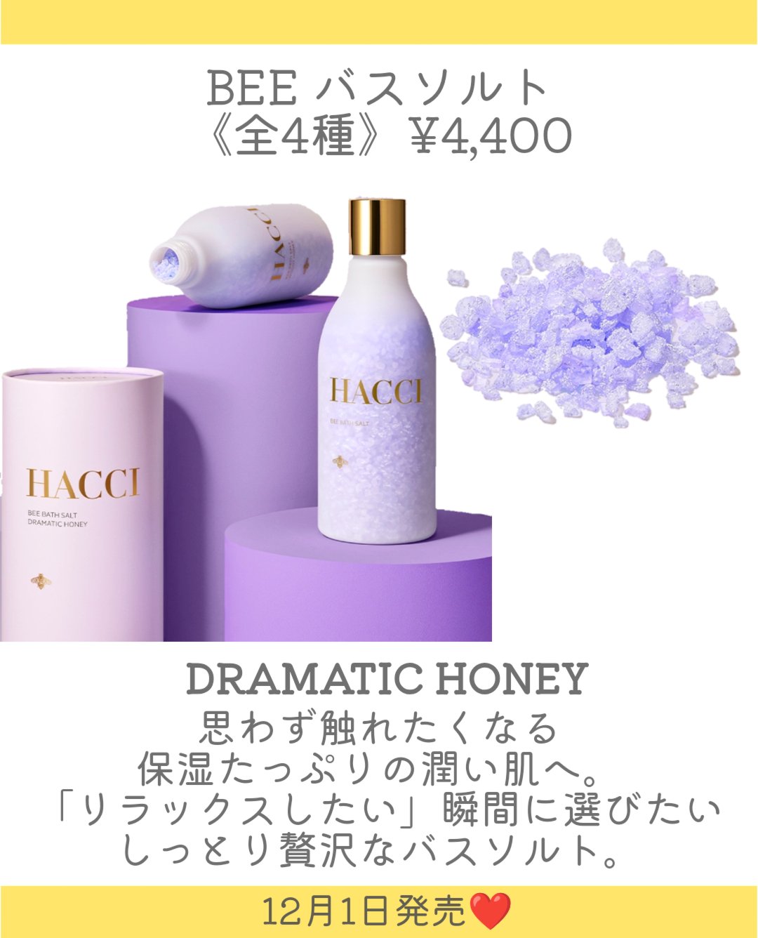 HACCI新作情報⟡.·*.··············································⟡.·*.発売日12/01マカロンのような可愛らしいバスソルトが登場♥BEEバスソルトフローラルハニー4.400円みずみず...