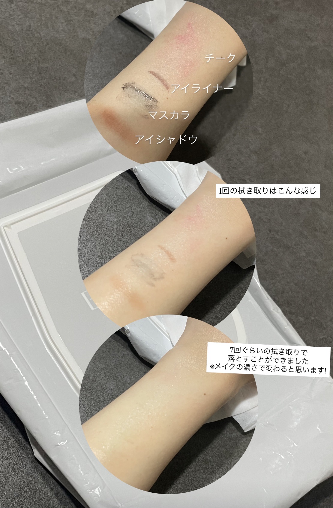 ヒタヒタなので摩擦が気にならない 🌸1枚でメイク全部落とせる大判 洗い流しも必要なく、これで化粧水まで終わるからすごーく便利で手放せない!笑 メイクもするんするん落ちる✨ (ウォータープルーフのマスカラは少し落ちにくいのでそこだけ気をつければ🙆♀️)