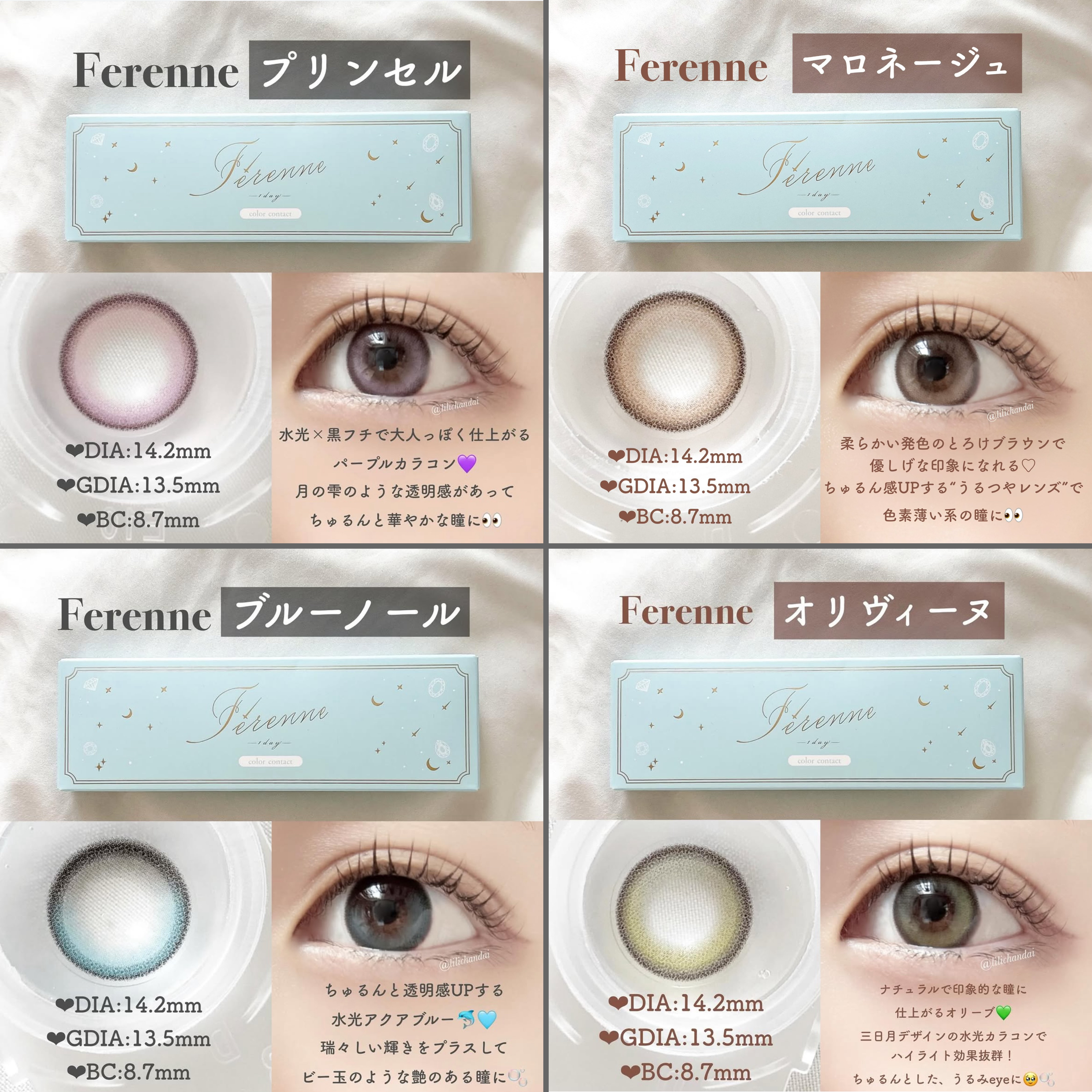久しぶりのFerenne✨🏰 今回の新色はデイリーで使える水光カラコンだよ!! 明るめのキャラメルブラウンでパッと瞳をトーンアップ☀️⤴️ さり気ない細フチが儚げっぽさを感じさせてくれる!! 優しい青みが涙目を誘うグレーカラコン☔️ 控えめ発色だからグレーはグレーでも派手にならずナチュラルにカラーリングしてくれる🩶