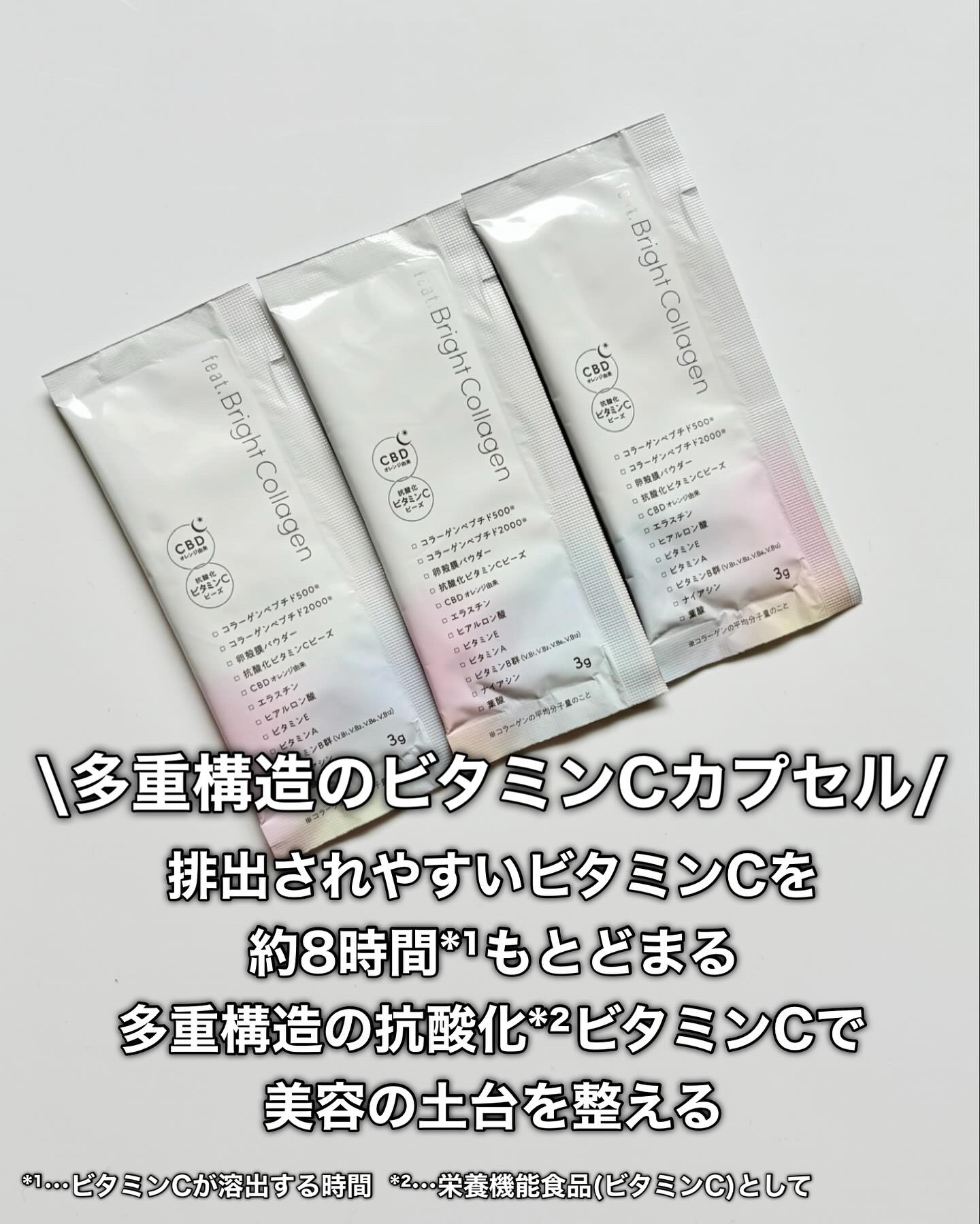 - サイズの異なるコラーゲンペプチドと、時間をかけてじっくり溶ける多重構造ビタミンCビーズを1包に詰め込んだ、キレイ習慣をサポートする栄養機能食品。多忙な毎日をサポートするアメリカで話題のCBDをはじめ、年齢とともに減少するエラスチンやヒアルロン酸、ビタミンA、ビタミンE、ビタミンB群、葉酸も同時に摂れます。 ●レモネード味●持ち運びに便利なスティックタイプ(そのまま飲んでも、水に溶かして飲んでも) 【栄養機能食品(ビタミンC)】ビタミンCは、皮膚や粘膜の健康維持を助けるとともに、抗酸化作用を持つ栄養素です。 ●本品は、多量摂取により疾病が治癒したり、より健康が増進するものではありません。●1日の摂取目安量を守ってください。●本品は、特定保健用食品と異なり、消費者庁長官による個別審査を受けたものではありません。●食生活は、主食、主菜、副菜を基本に、食事のバランスを。