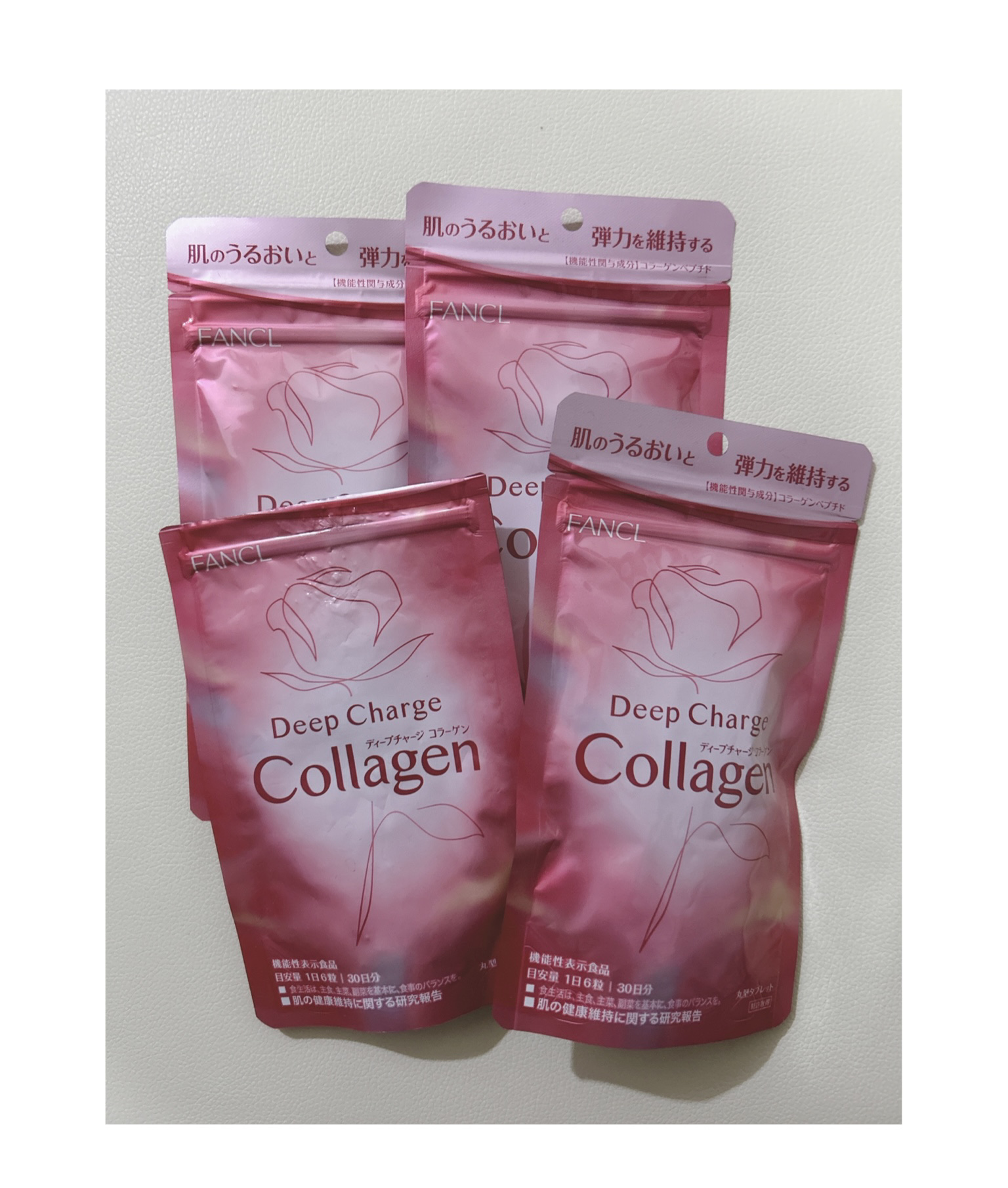 - <ディープチャージ コラーゲン> コラーゲンペプチド(国内製造)、でんぷん、バラつぼみエキス末、イソクエルシトリン含有物、セルロース、ビタミンC、微粒二酸化ケイ素、ステアリン酸カルシウム、環状オリゴ糖、シェラック