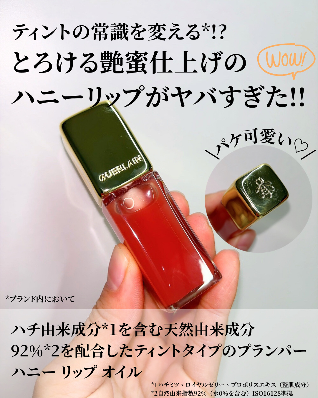 - 【ベスコス多数受賞】フレンチハニー¹の恵みを凝縮。下地から仕上げまで使える、ツヤ蜜リップオイル ハチ由来成分²を含む天然由来成分92%³を配合したティントタイプのプランパー ハニー リップ オイル。 うるおいを与えるテクスチャーでケア。つけた瞬間からふっくらボリュームアップ⁴し、ベタつくことなく、3Dツヤ蜜の仕上がりを叶えます。使うたび潤いを与え、美しい唇に整えます。 とろけるように魅力的な6つのシェードをご用意。唇を自然に色づけて、艶やかな光沢感で包みます。 ¹ハチミツ(整肌成分) ²ハチミツ、ローヤルゼリー、プロポリスエキス(整肌成分)³自然由来指数92%(水0%を含む)ISO16128準拠 ⁴メイクアップ効果