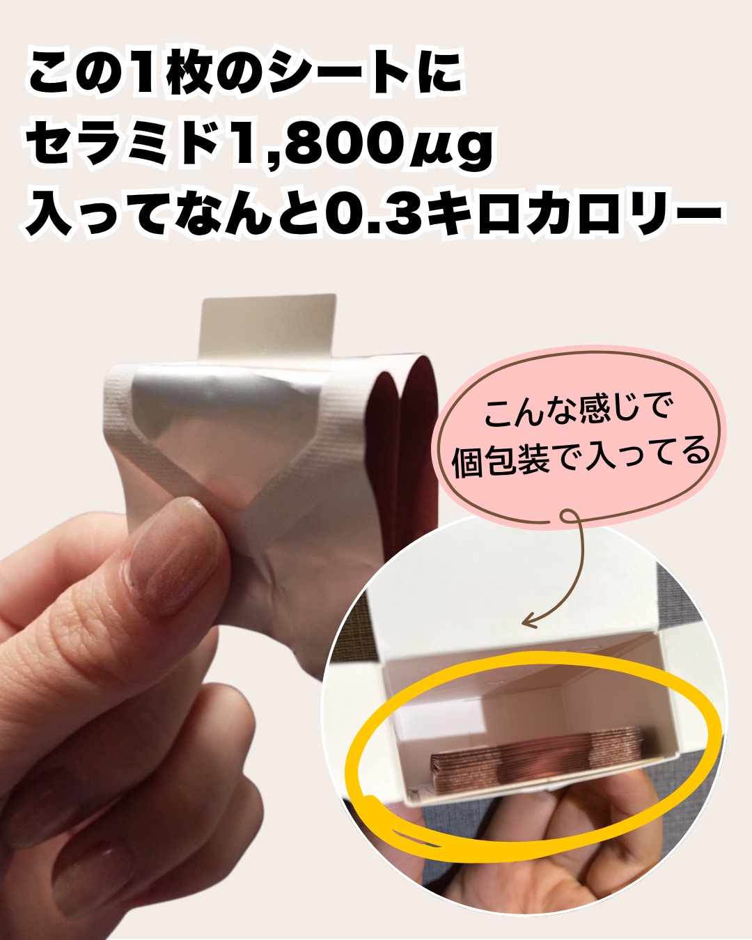 - ● 1枚に米由来セラミド1,800μgを高濃度で配合 ● わずか0.1mmの厚さで、口内ですーっと10秒で溶ける ● 個包装タイプで外出先でもスマートに摂取可能 ● 1日1枚を目安に毎日の美容習慣に