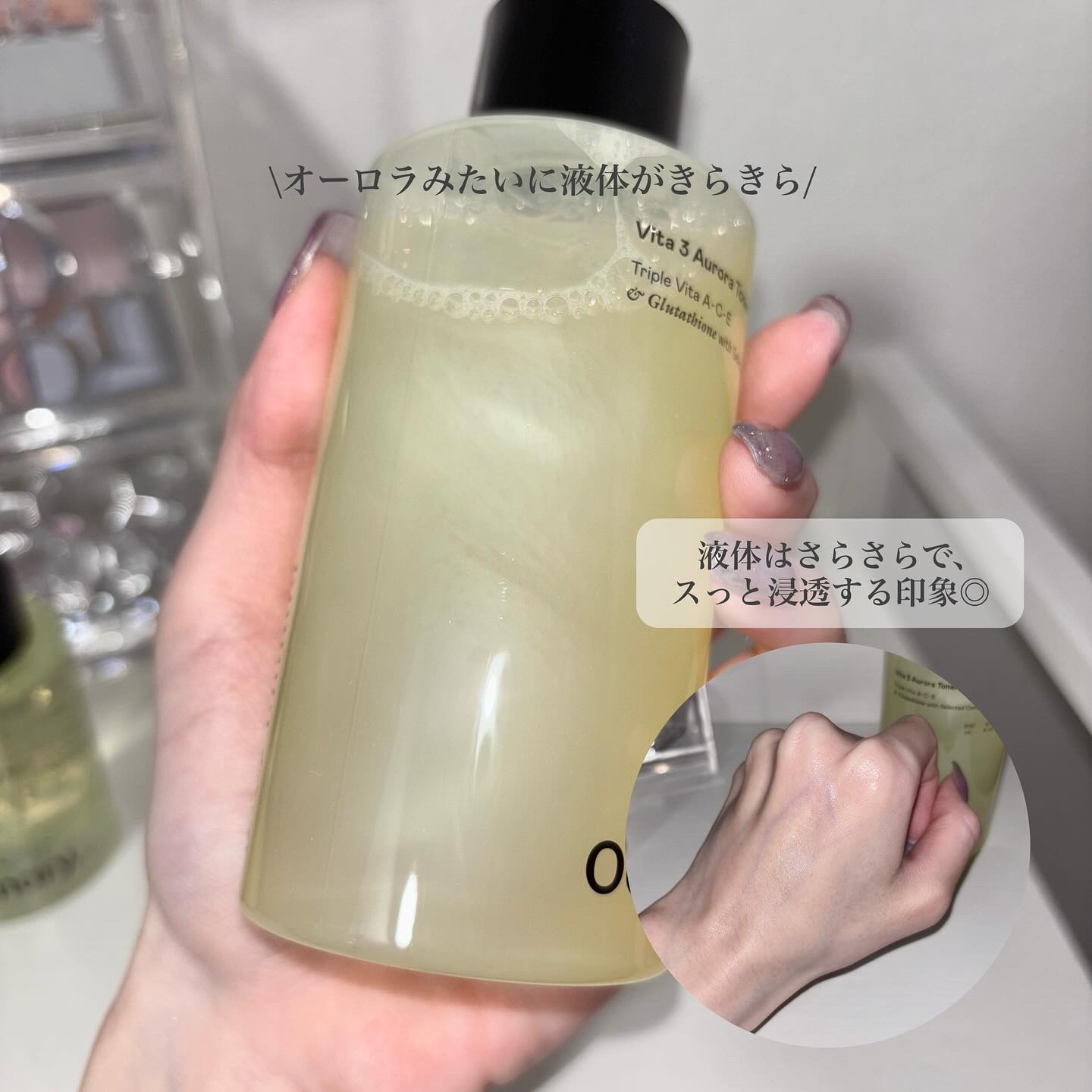 | 少しとろみがあるけど肌に出すとすーっと垂落ちてくるくらいのゆるめのテクスチャーで、のびが良い! | 詳細を見る | |