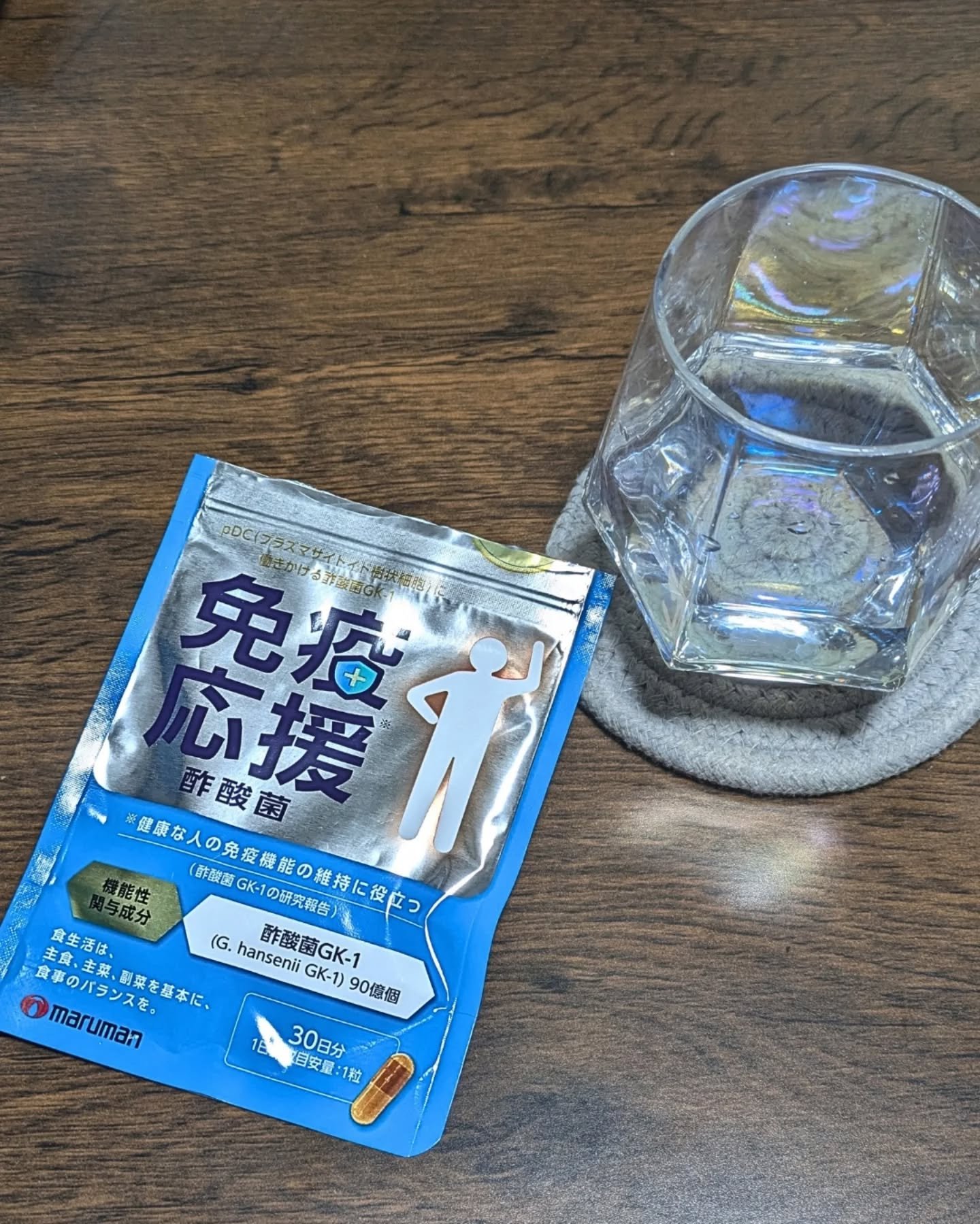 - 1日1粒で、90億個の酢酸菌GK-1を摂取可能。忙しい現代人にもぴったりです。カプセルタイプなので、持ち運びも便利で、いつでもどこでも手軽に摂取できます。 機能性関与成分:酢酸菌GK-1(G. hansenii GK-1) 届 出 番 号:J323 届 出 表 示:本品には酢酸菌GK-1(G. hansenii GK-1)が含まれます。酢酸菌GK-1は、pDC(プラズマサイトイド樹状細胞)に働きかけ、健康な人の免疫機能の維持に役立つことが報告されています。 摂 取 の 方 法 :1日1粒を目安にそのまま水またはぬるま湯と一緒にお召し上がりください。