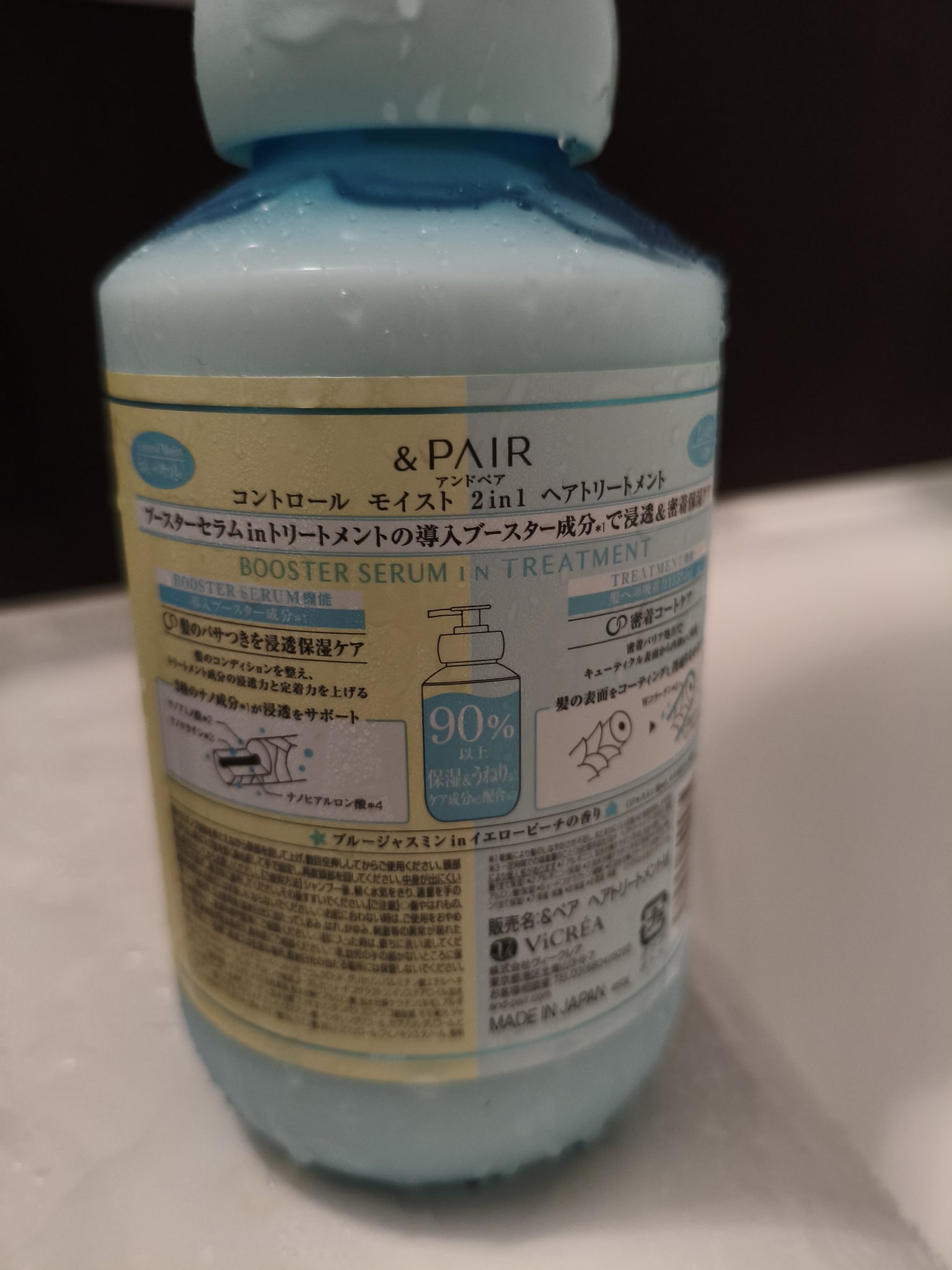 - &PAIRは「タイパ美容」に着目し、1本で2つの機能を持ち合わせたヘアケアブランドです。 コントロール モイストシリーズはうねり※1とパサつきを同時にケアし、しっとりな仕上がりに導きます。 シャンプーにはナノバブルパーツが採用されており、本体を振ることでナノバブルを発生させることができます。 ナノサイズの微細な泡で毛穴の皮脂汚れを滑らかに洗い流します。 ヘアトリートメントは導入ブースター成分*1で保湿成分の浸透をサポートし、 髪のパサつきに浸透保湿ケアができる導入ブースター機能のあるヘアトリートメント。 製品の90%以上が保湿&うねり※1ケア成分*2で構成し※2、指通り滑らかなしっとり髪へ導きます。 石油系洗浄成分不使用・パラベン不使用・動物実験不実施(製品として)・合成着色料不使用・サルフェート不使用(ラウレス硫酸Na)・鉱物油不使用 ※1 乾燥により髪のしなやかさが不足し、まとまりにくい状態 ※2 基剤を除く、水を含む *1 アルギニン、加水分解ケラチン(羊毛)、加水分解ヒアルロン酸(全て保湿) *2 γードコサラクトン(補修)